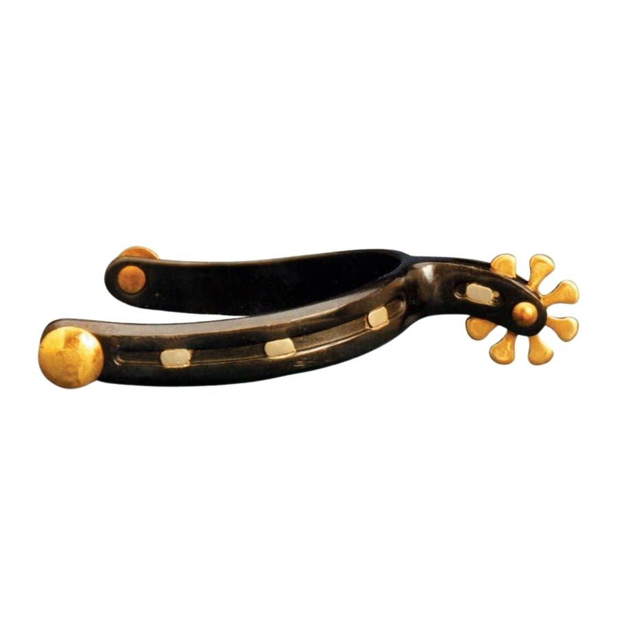 These spurs ride right on the boot and communicate with horse well. A black steel horseshoe spur with 1 1/4" band with three brass nailheads, fixed brass buttons and 8 point brass rowels.
