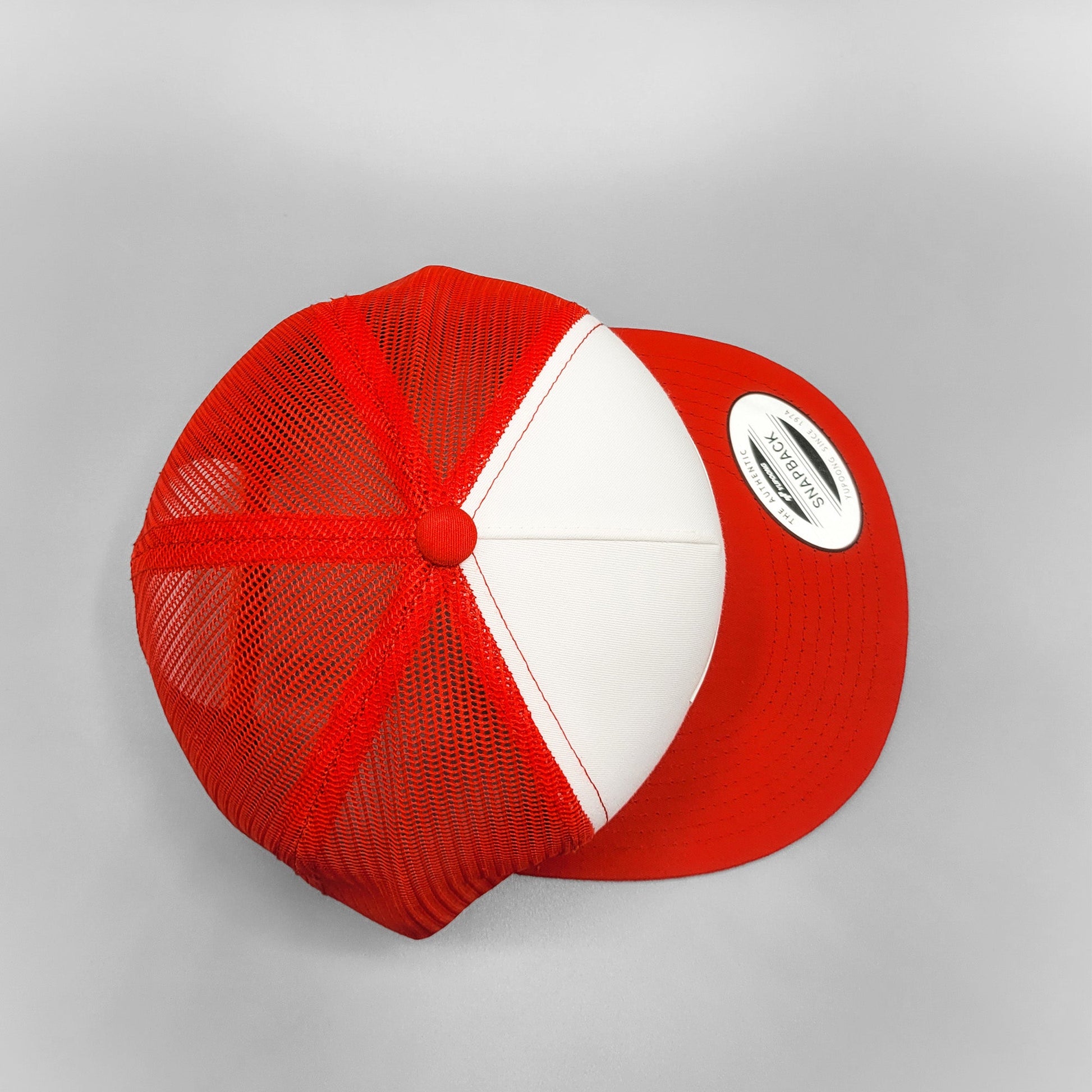 - - Classic white and red mesh trucker cap with premium, matching mesh panels