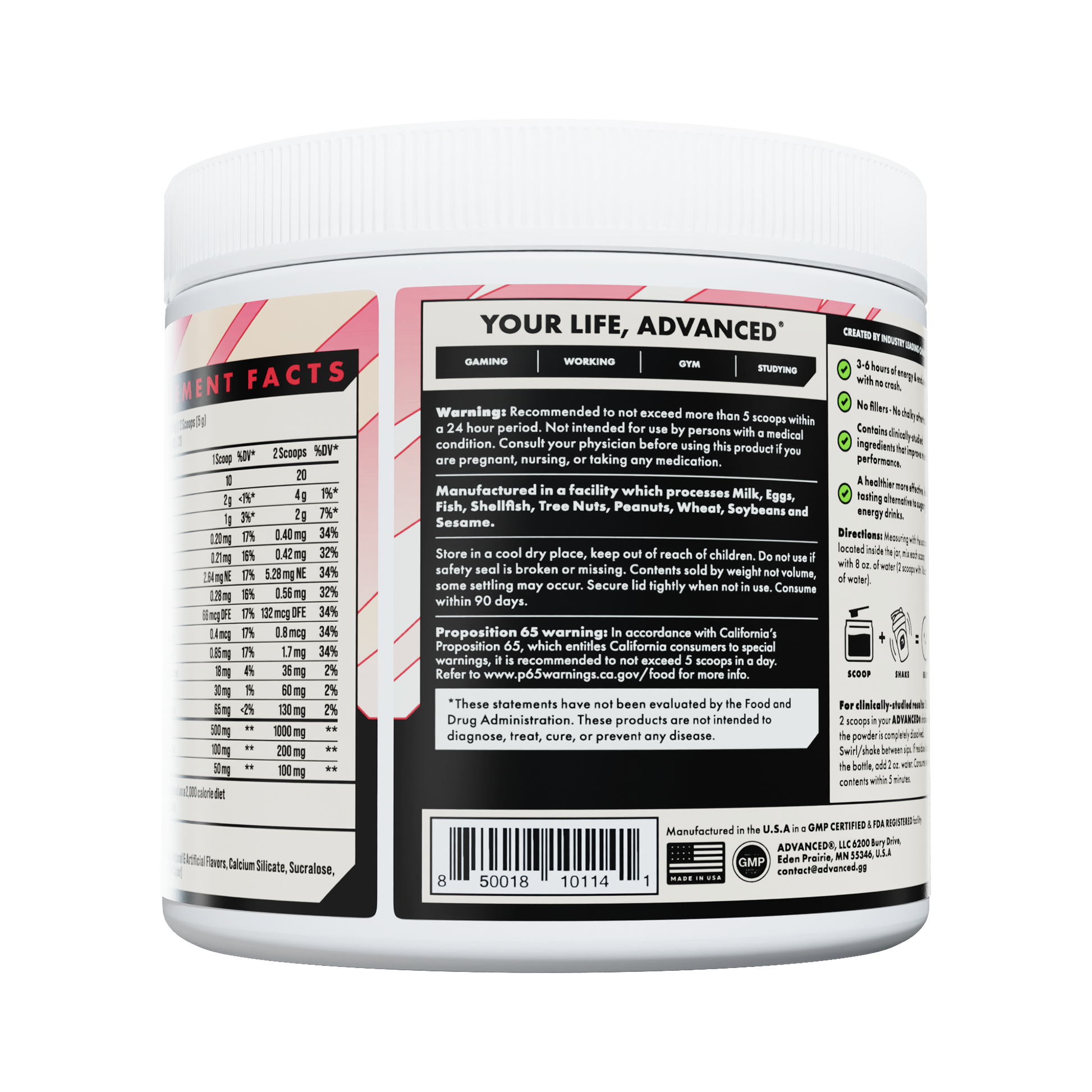 Looking for an energy supplement to help you dominate your gaming sessions, power through the workday, or crush it at the gym? Then ADVANCED ENERGY is what you’re looking for.
