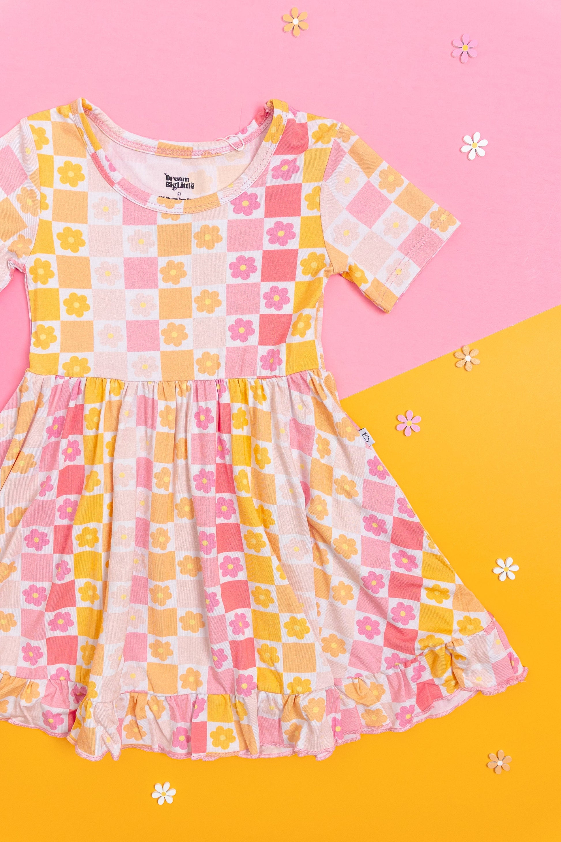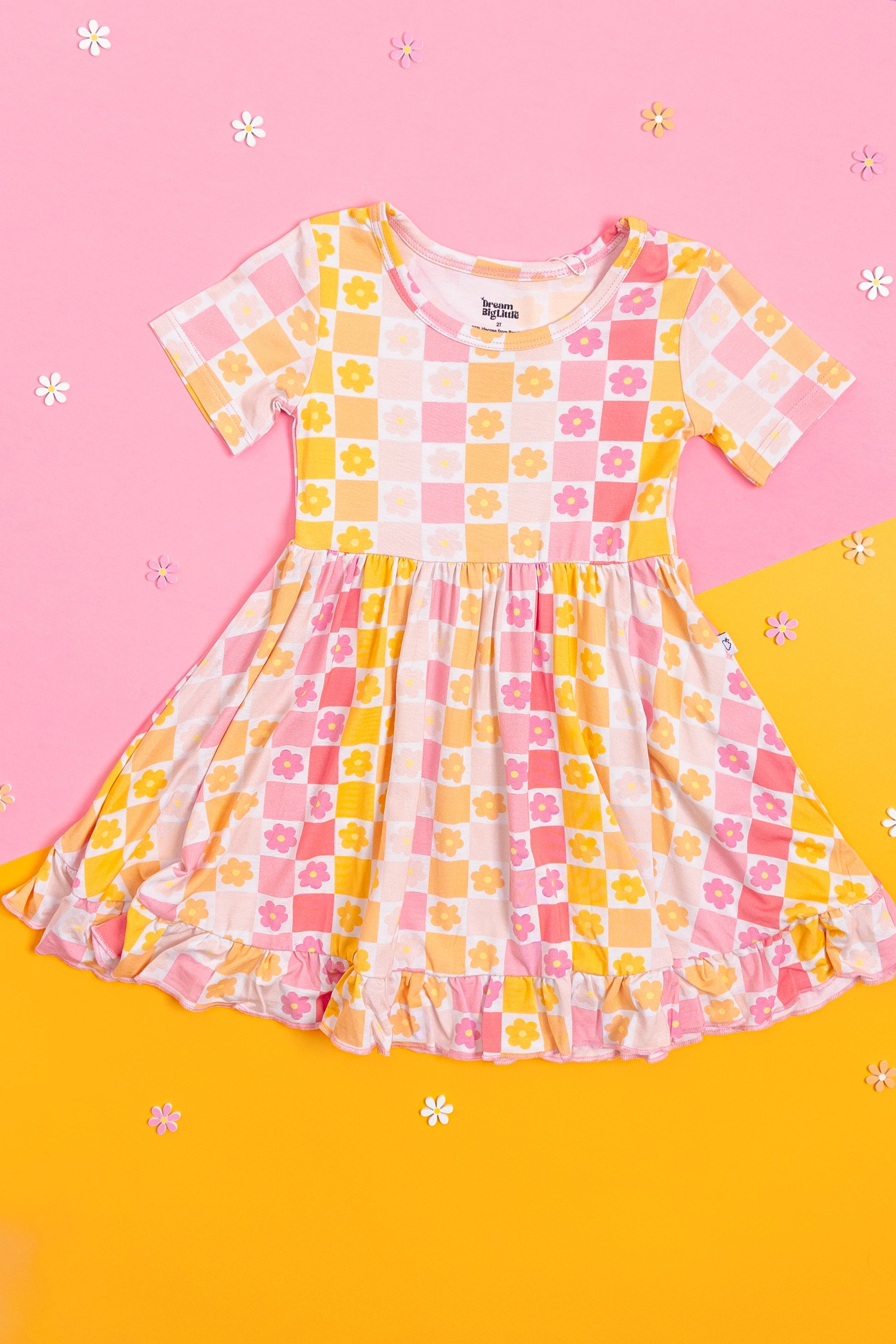 Add a pop of color to your wardrobe with our Summer Sunset Checkers Dream Ruffle Dress. Made from soft bamboo material, this short sleeve dress features a playful ruffle design and vibrant flowers. Perfect for a day out in the sun!