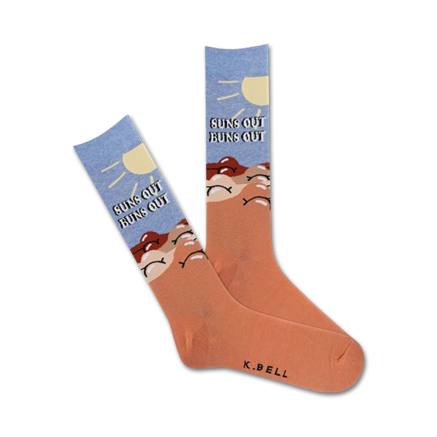 Suns Out Buns Out! These bright and breezy crew socks are the perfect way to say goodbye to winter and hello to summer. Featuring a cheerful orange base with blue toes and heels, these socks are adorned with a sun and the phrase "Suns Out Buns Out" in bold black text. Fun Fact: Did you know that the saying "Suns Out Buns Out" originated from the 1980s and meant to have fun while there is sun before cold weather hits? And who knows, maybe wearing these socks will manifest some warm weather for you!