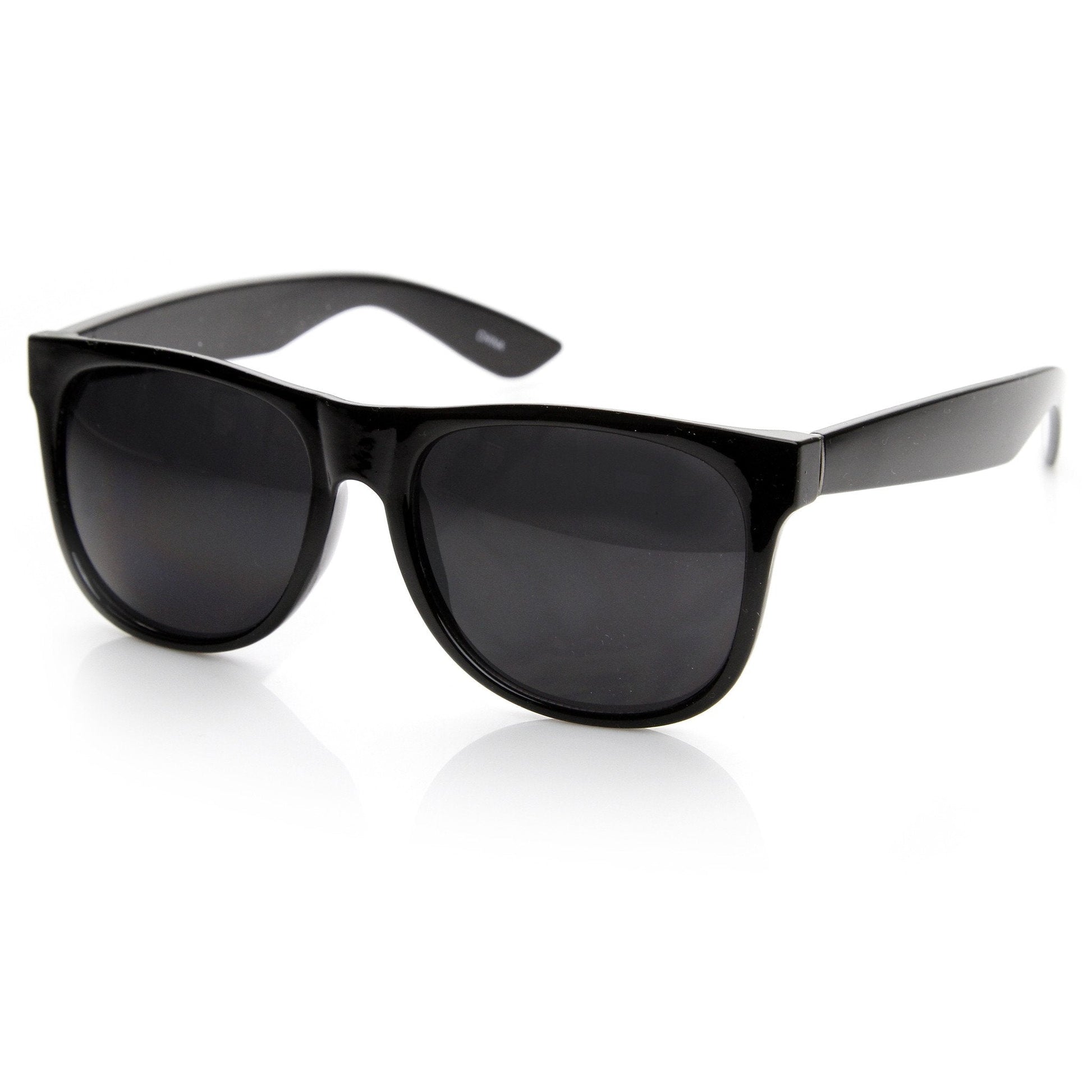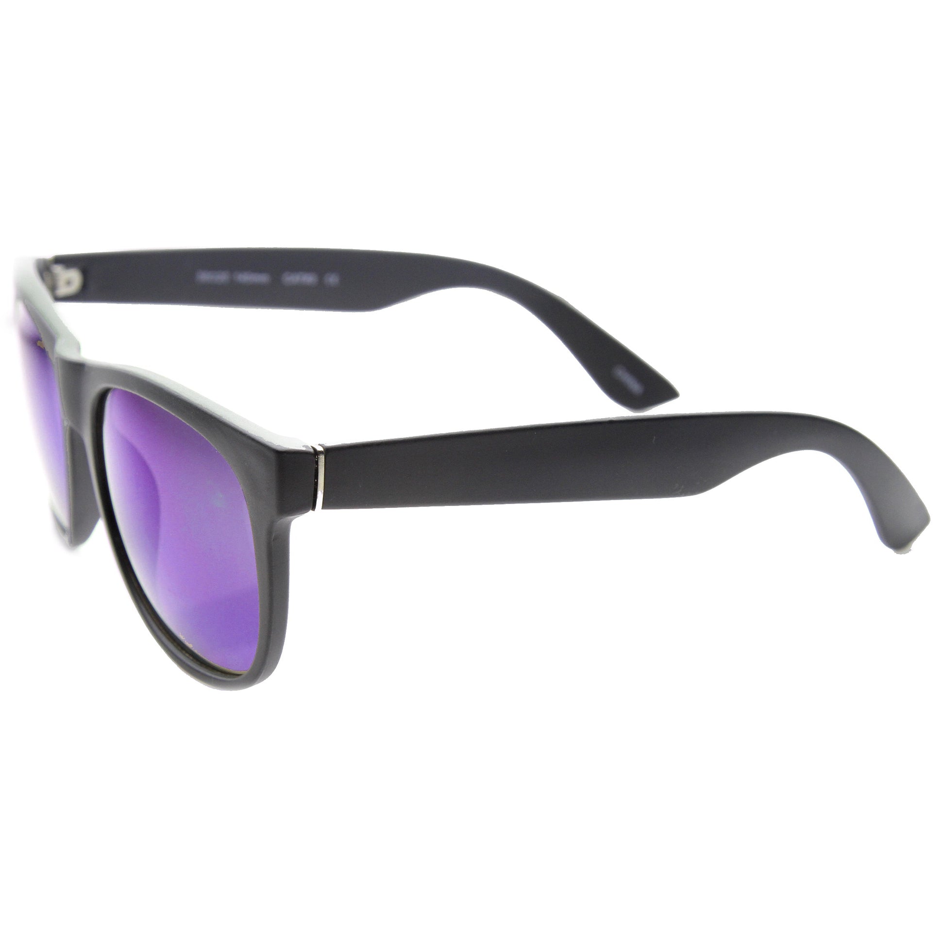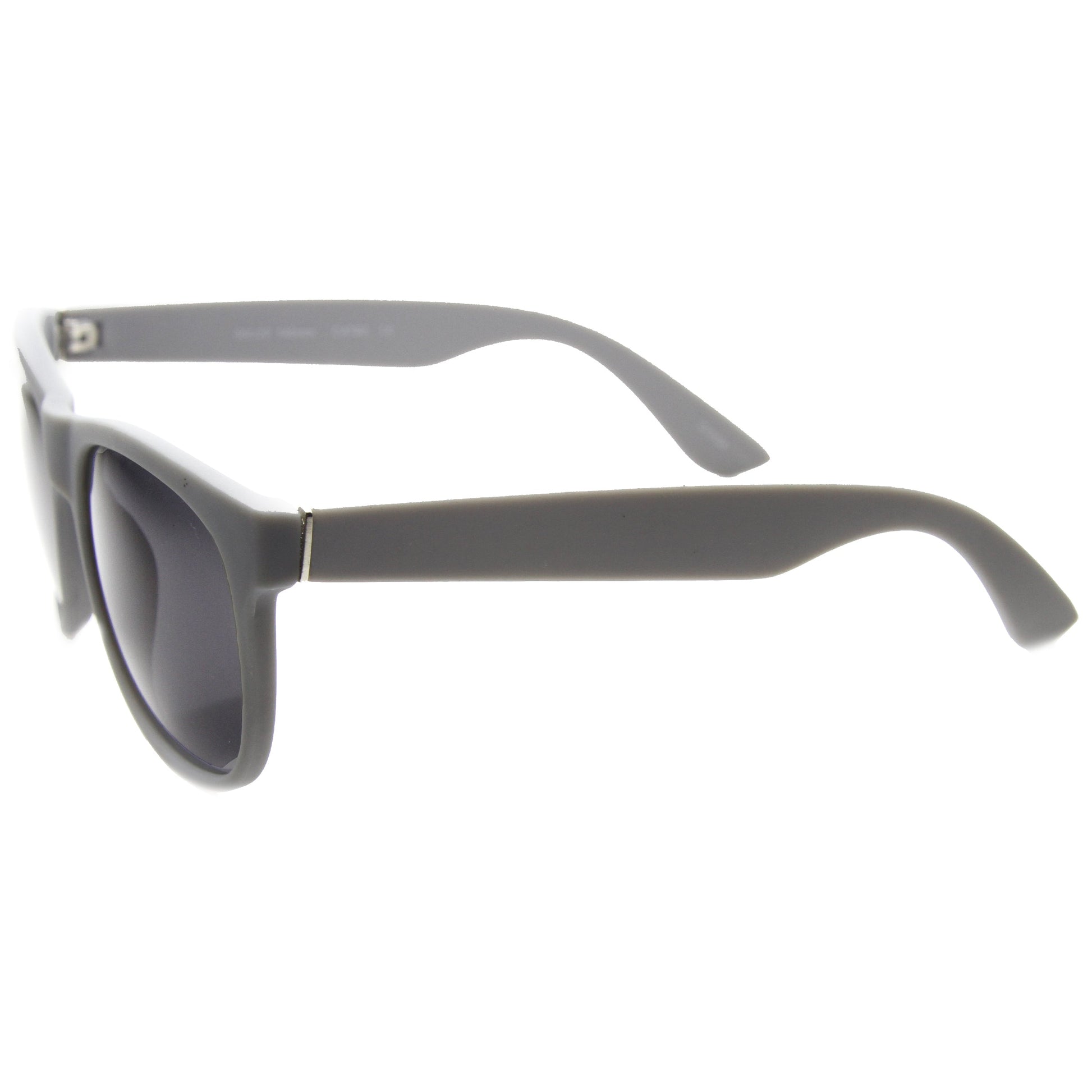 Designer inspired horned rim sunglasses that feature a classic basic shape that is slightly rounder than an average horned rim frame and features metal tabs at edge of the temples. Made with an acetate based frame, metal hinges and polycarbonate UV protected lenses.