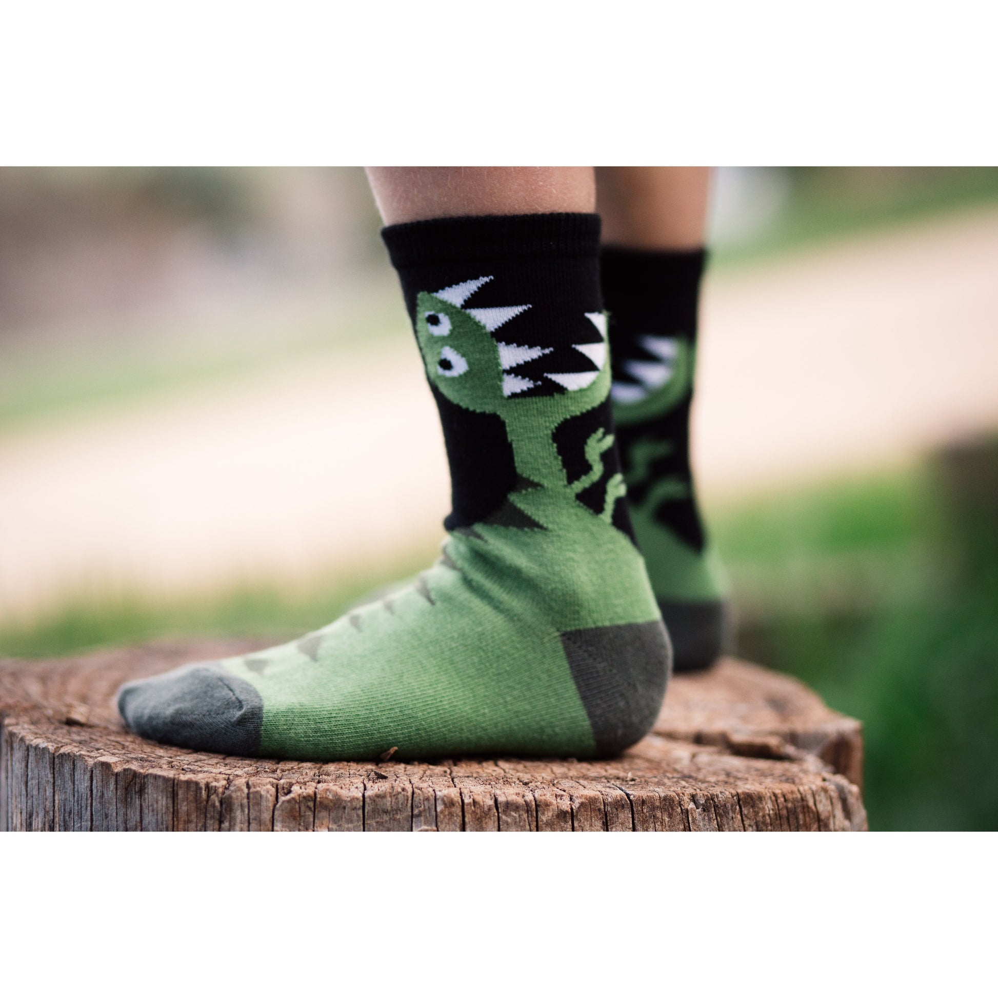 Did you know that the T-REX had a set of about 60 teeth that were the size of bananas? Are you a fan of the biggest, baddest prehistoric predator to ever exist? If the tyrant lizard king is your favorite dinosaur, then you will love these cool kid's novelty crew socks! Each pair features a T-REX chomping its way up the sock.