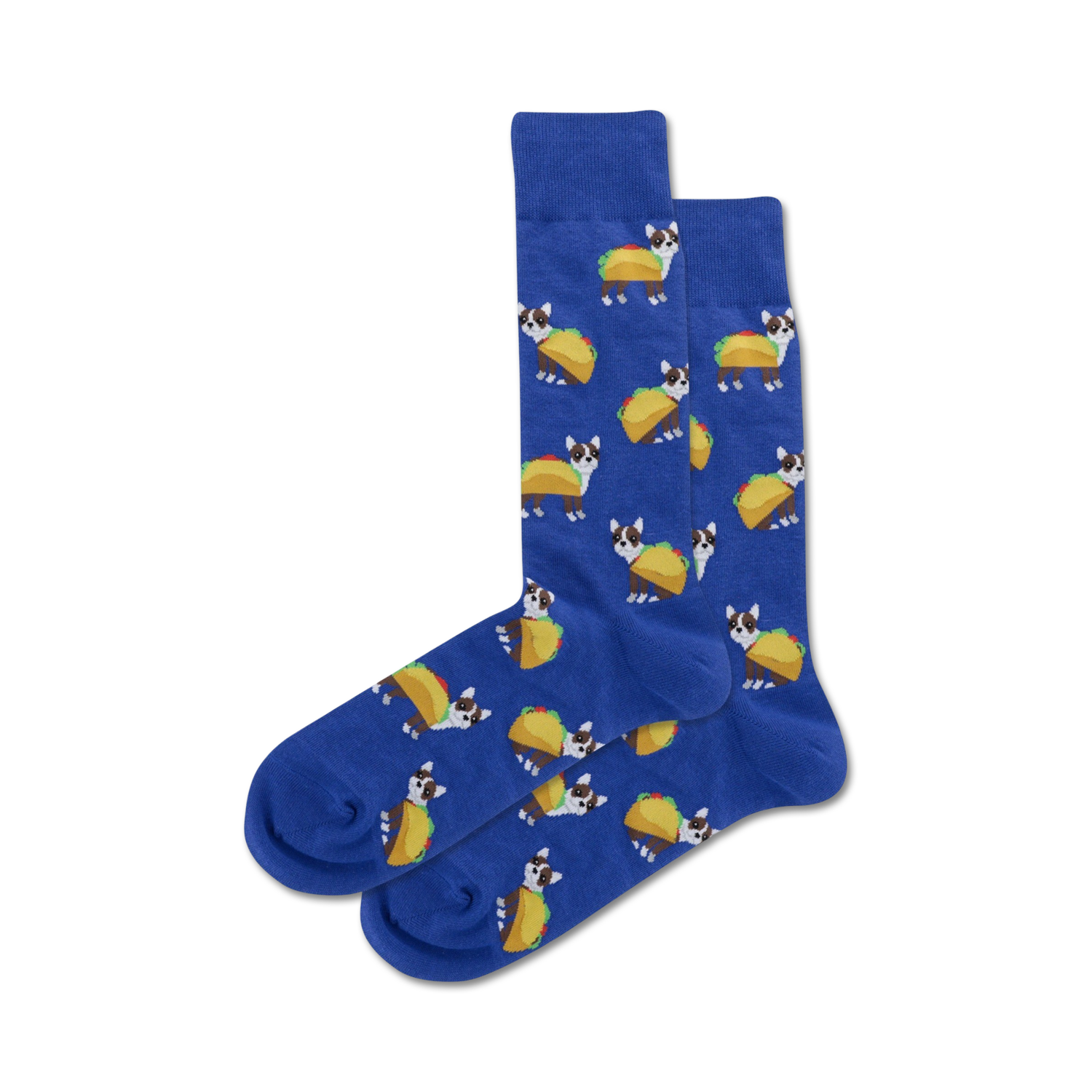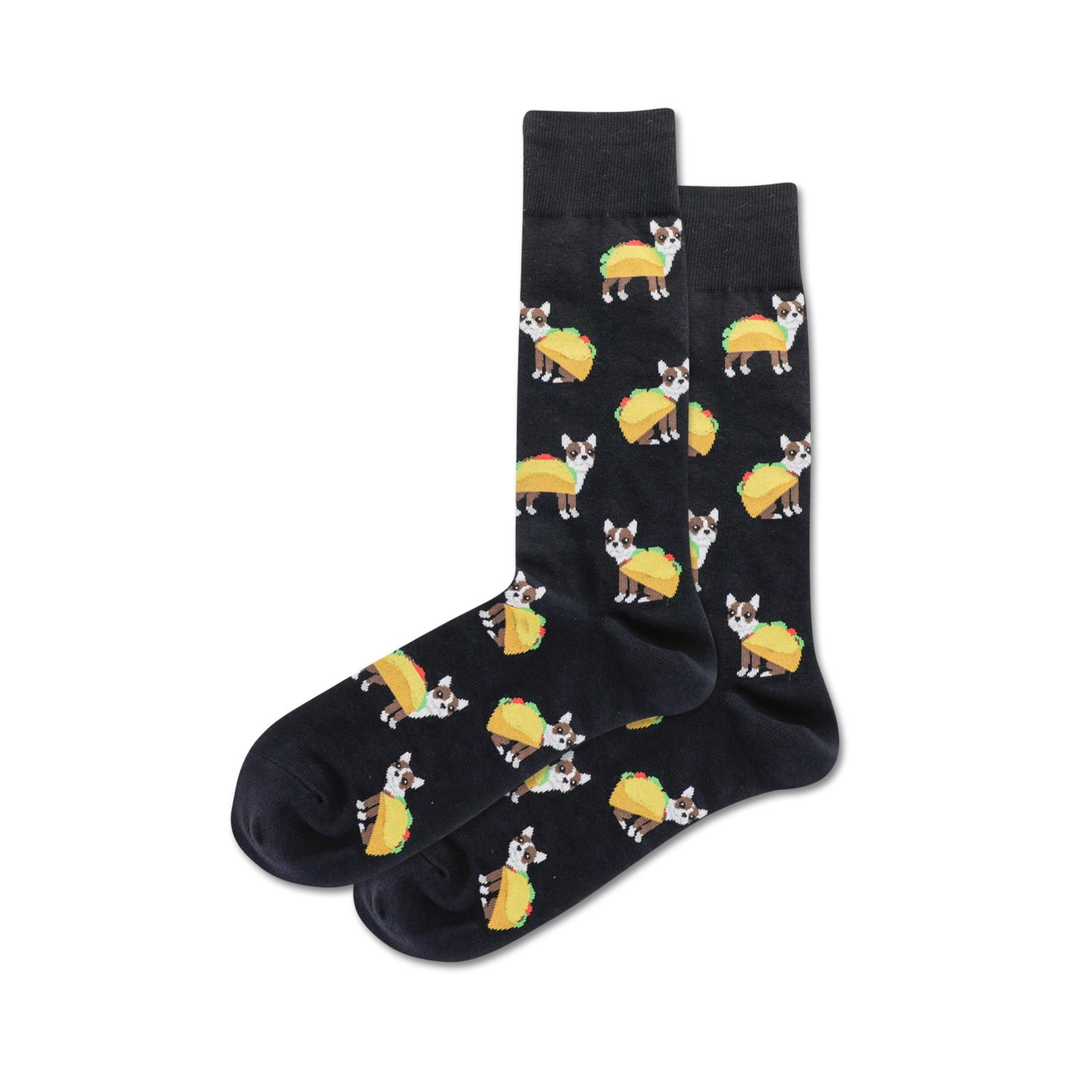 Meet Taco Terrier: the sock pairing that's as paw-some as it is delicious! These black crew socks feature a cartoon-like pattern of tacos with tiny terrier dogs wearing them like ponchos. We dare you to resist smiling when you slip into a pair of these on your next taco run!