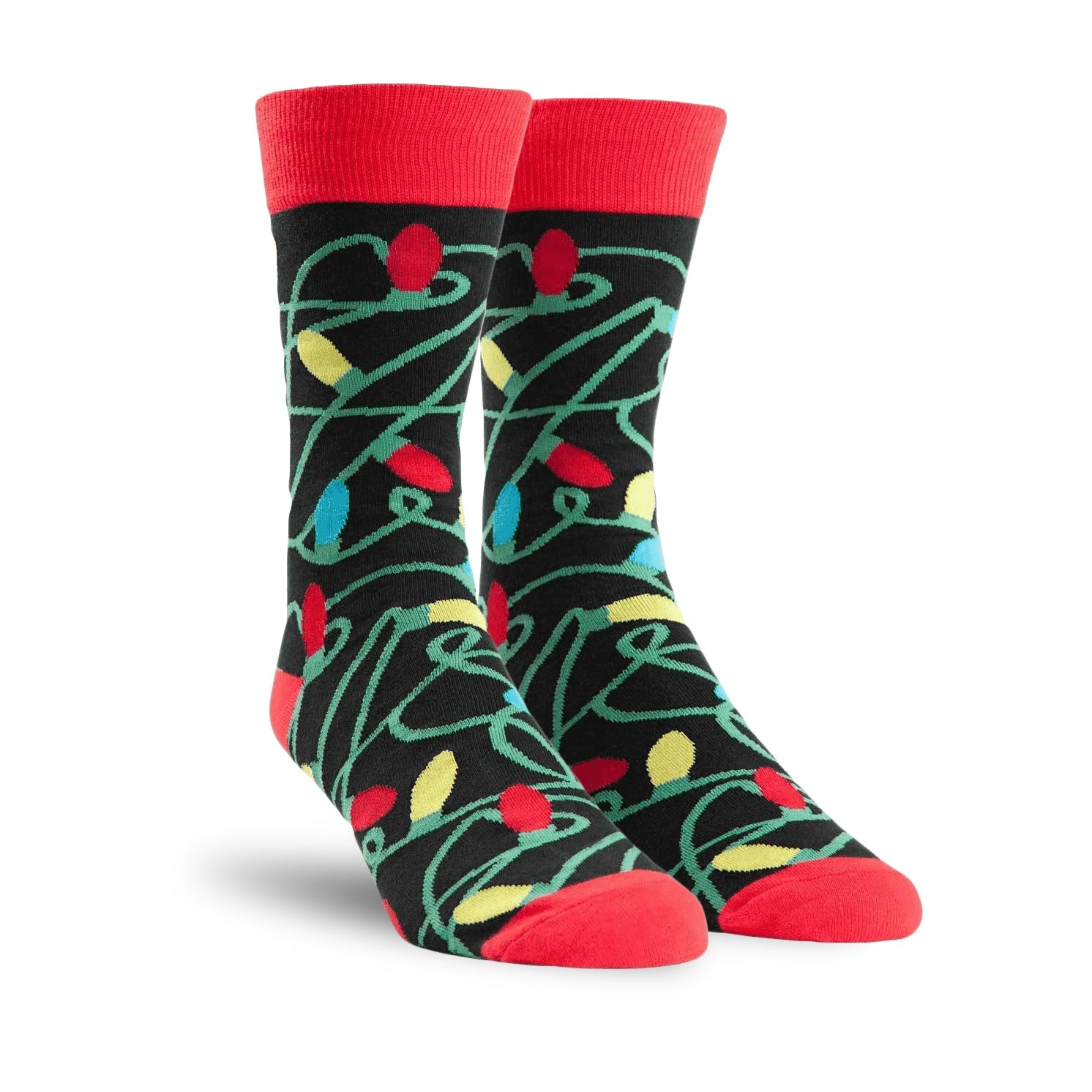These 'Tangled Lights' socks are a fun, festive pick-me-up. They're shown in black with a pattern of colorful Christmas lights in red, yellow, blue, and green, all tangled up in a playful design. The visible portion of the socks has a red cuff. They're crew socks- a classic comfortable style. Perfect for adding a little holiday cheer to your outfit without going overboard.
