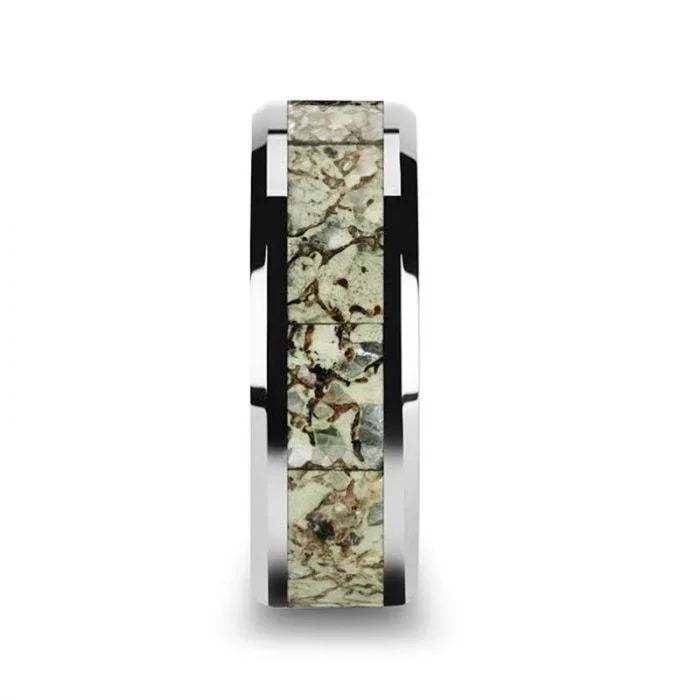 TARGARYEN Men’s Tungsten Wedding Band with Green Dinosaur Bone Inlay & Beveled Edges - 8mm