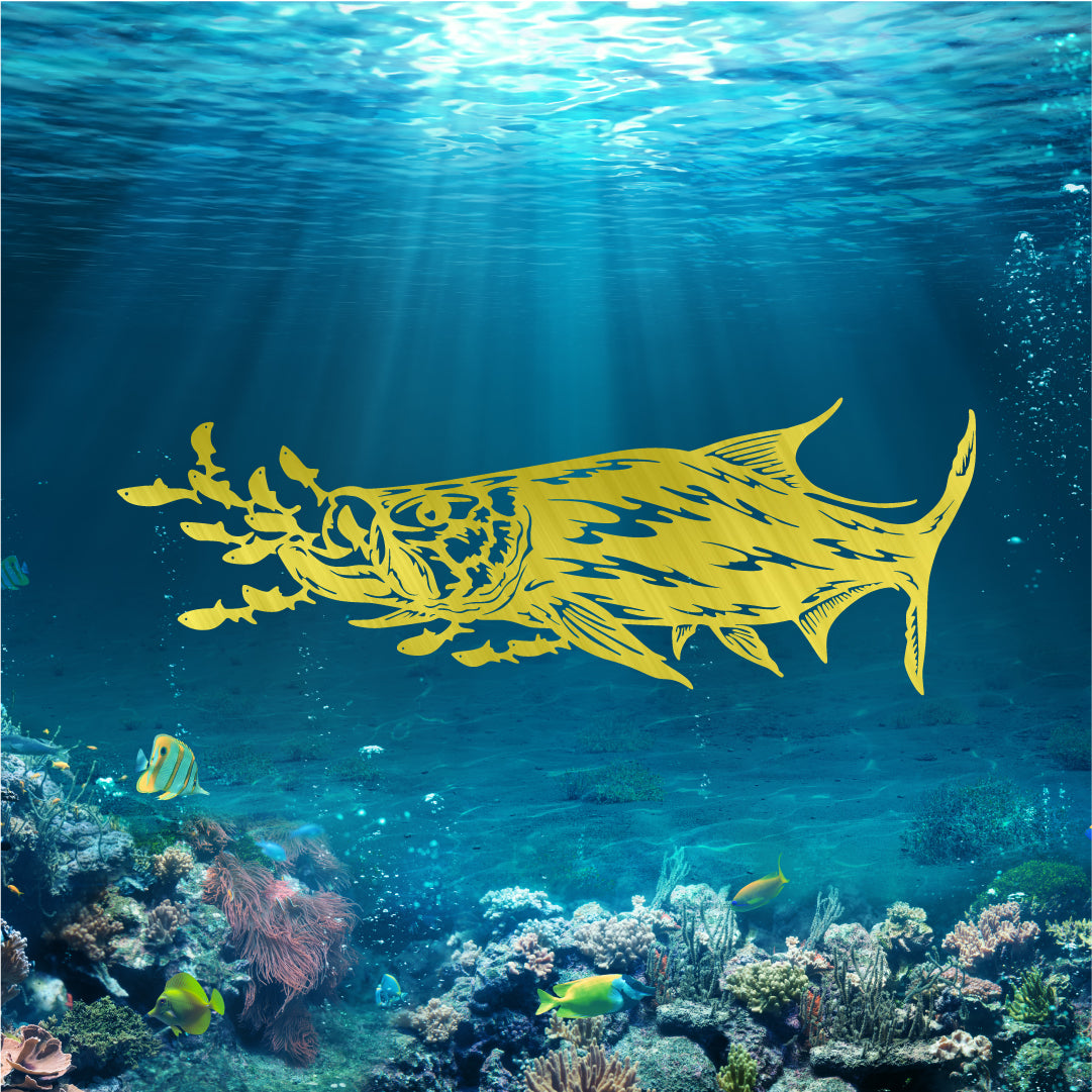 Crafted from durable 16 gauge steel, this Tarpon Chasing Bait captures the dynamic energy of a tarpon in pursuit. Its striking metal art design adds a bold, artistic touch to any space, making it a perfect piece for enthusiasts who appreciate both strength and beauty in their decor.