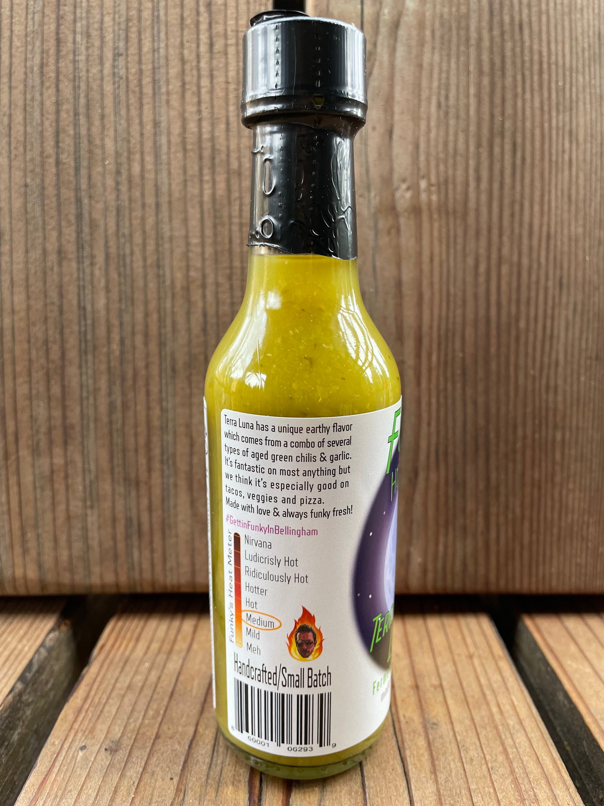 Terra Luna is a fermented green chili sauce made from 4 different green chilis. It has a unique earthy flavor which comes from an aged chili mash consisting of jalapeno, serrano, anahiem & poblano peppers plus garlic. It’s fantastic on most anything but we think it’s especially good on Latin foods, veggies and pizza!