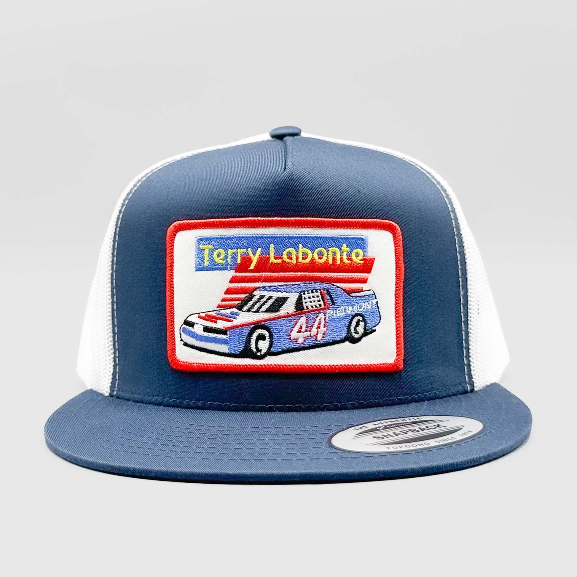 This is a vintage style Terry Labonte #44 stock car racing embroidered patch in red, white and blue threads, applied to one of our best-selling trucker hats -- a navy and white mesh Yupoong 6006 Classic snapback trucker hat.