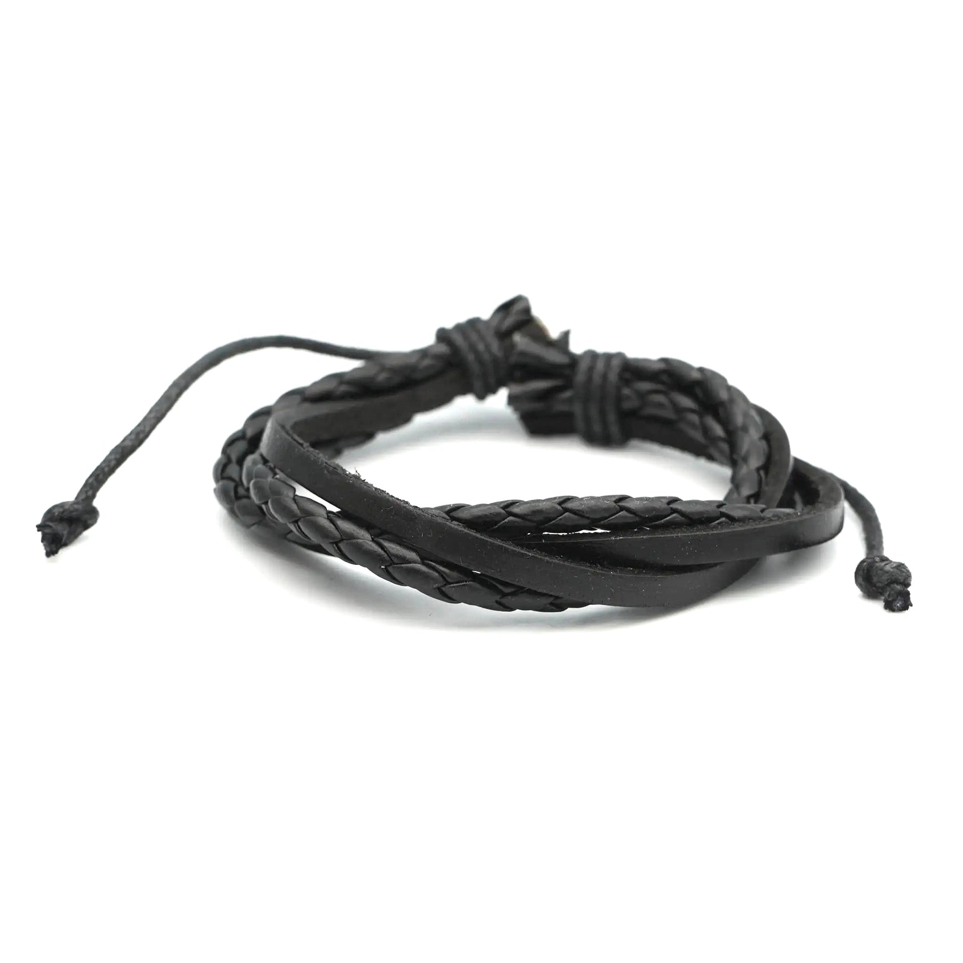 Waxed black cord is braided together in this multi-strand bracelets. One size fits most adjustable cord.