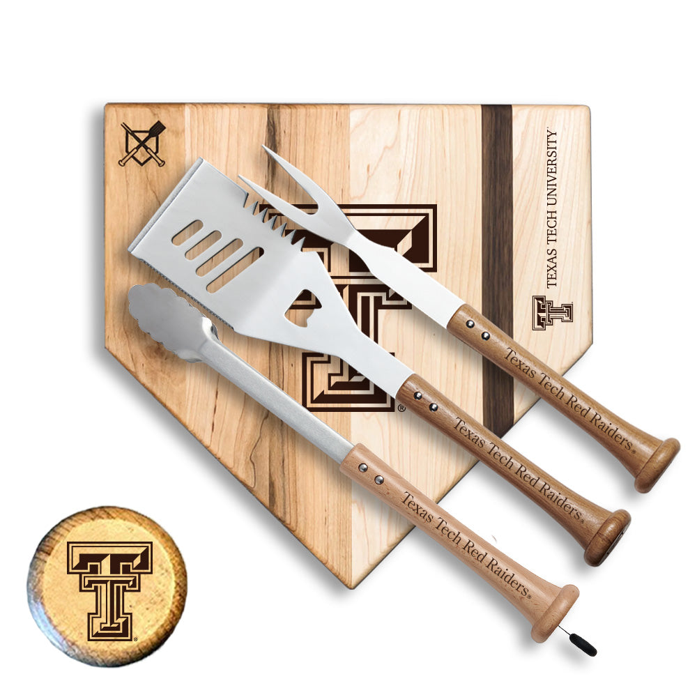 - Includes: "Slider" Spatula, "Forkball" Fork, "Splitfinger" Tongs, and "Home Plate" Cutting Board.