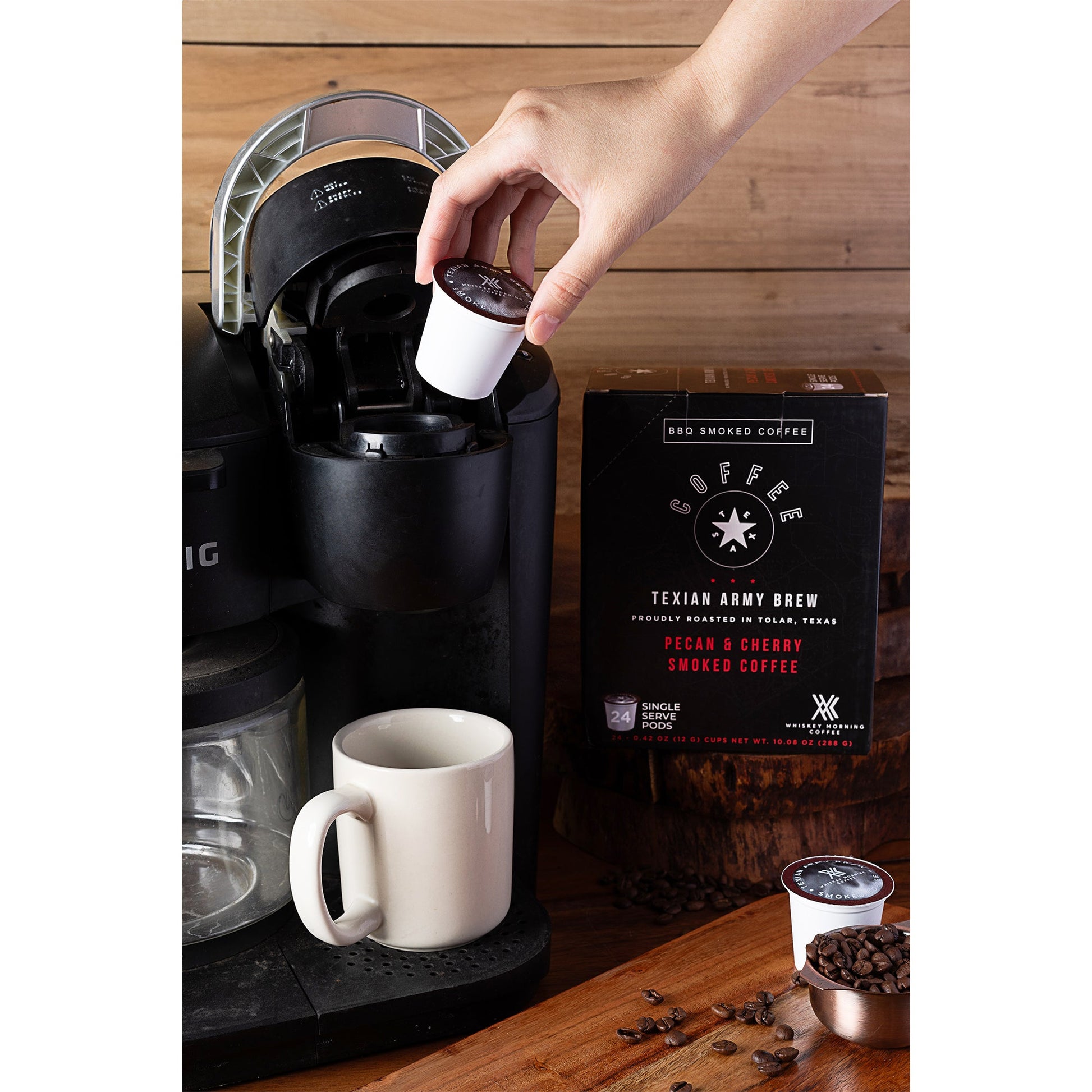 Experience the undeniable richness of freshly packed Texian Army Single Serve Pods - the same smoked coffee found in our bags!