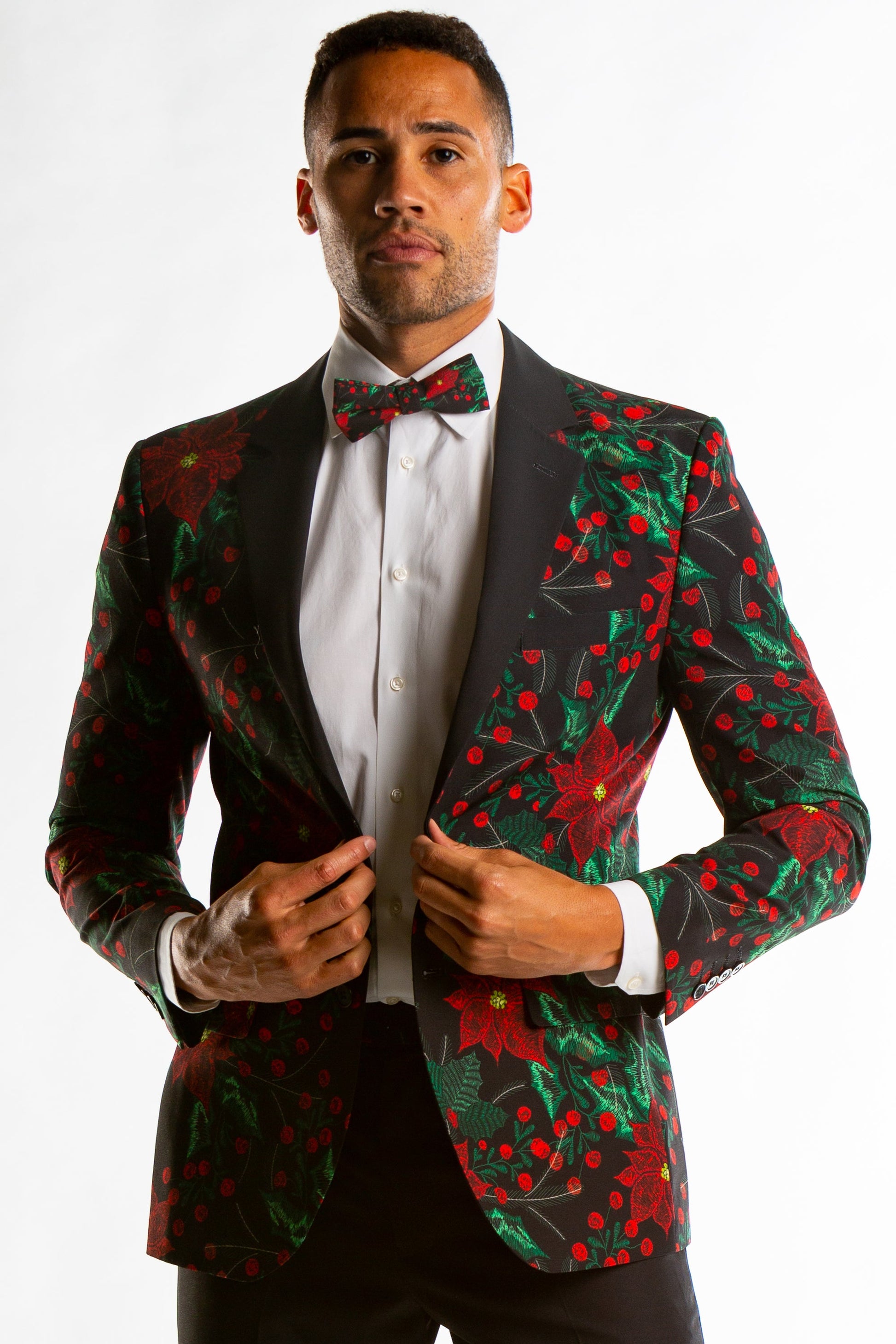 There exists a common myth that Poinsettias are toxic if consumed, but that is simply untrue. The only real danger this flower might cause is when you show up to a party wearing this Poinsettia covered Christmas suit. In fact, initial product testing reported elevated levels of lust and salacious behavior upon first sight. Our legal team has advised me to mention that we are not responsible for any intense love triangles or holiday party love-making sessions that may ensue due to the existence of this suit.