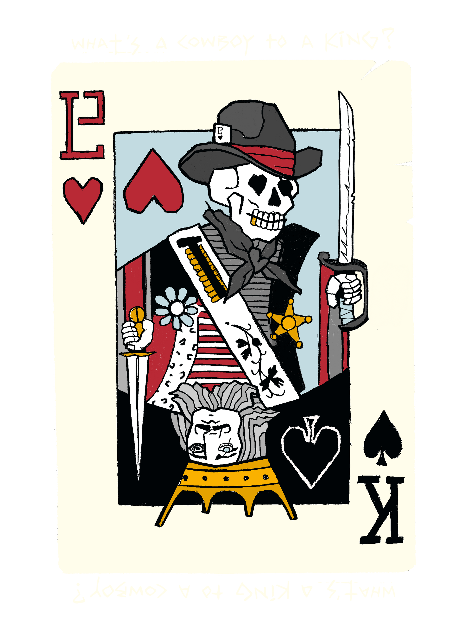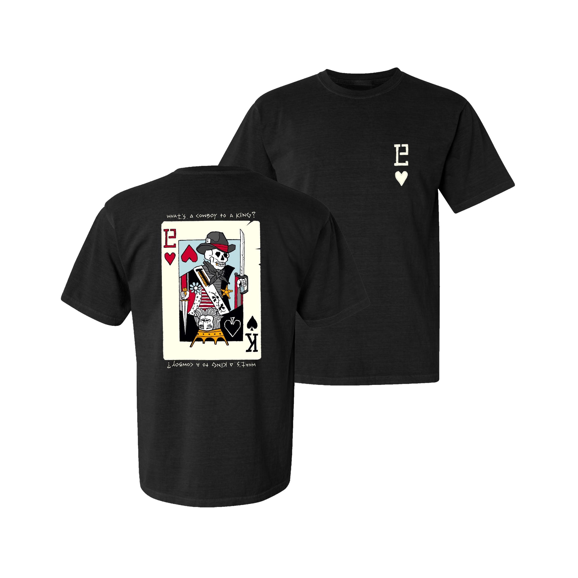 the "Cowboy King" T-shirt, a bold blend of Wild West swagger and regal sophistication. Featuring a King card motif with a cowboy twist, it poses the question: "What's a cowboy to a king?" Crafted for comfort and style, this tee is perfect for making a statement wherever you go.