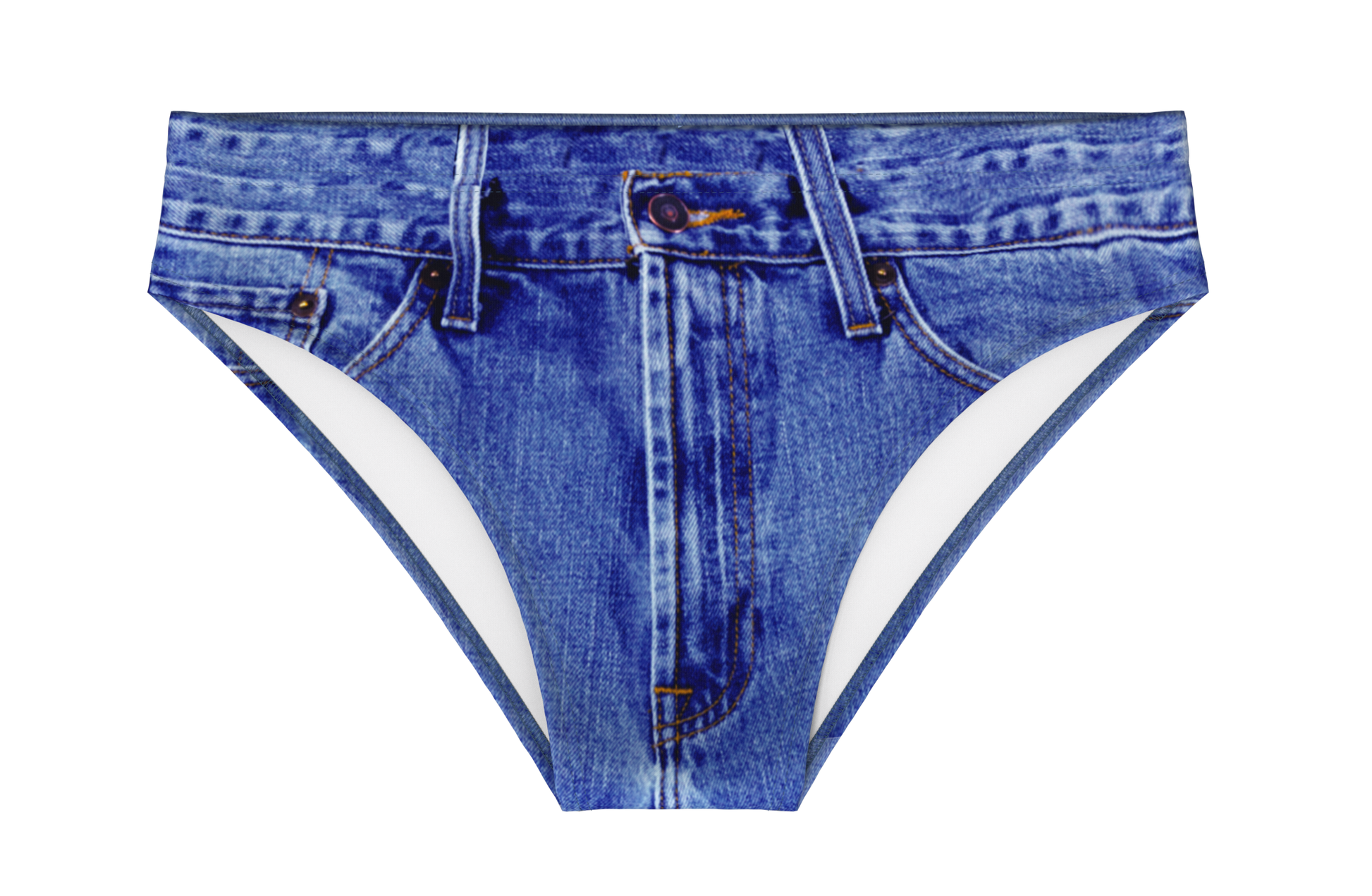 They say jorts are the above-ground pool of the shorts world. We'd be inclined to agree. Our denim print swim brief, also known as the Daytona Dong Sarong, is just like that, except it is the above-ground hot tub of the swim brief world...or something like that. It is like eating a bag of chips in church. Everyone looks over at you with disgust, but deep down they want some too. And if you're really risky you'll combine those last 2 sentences, eating a bag of chips in church while wearing this denim swimsuit. You'll probably get tossed out, but you'll look and taste good doing it.