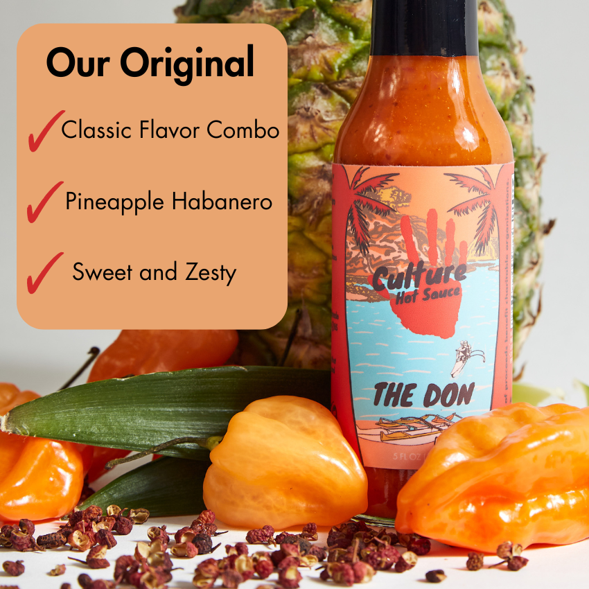 Experience the original Culture Hot Sauce recipe—a classic fusion of sweet pineapple, zesty mustard, and fiery habanero with a signature Szechuan peppercorn tingle. This bold, fiery-orange hot sauce delivers a perfectly balanced heat that lingers just right, making it a fan favorite since day one. Whether you're marinating meats, spicing up tacos, or adding depth to everyday meals, The Don is the ultimate go-to hot sauce.