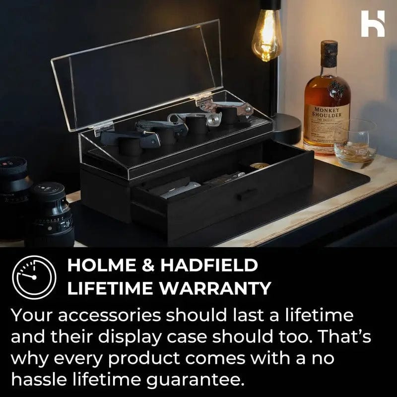 Protect Your Collection — This wooden display case shields your pocket knives from dust and scratches beneath the clean hinged cover and felt-lined drawer. The Knife Deck Pro also includes vegan leather padding, providing your collection the extra protection and sleek finish it deserves