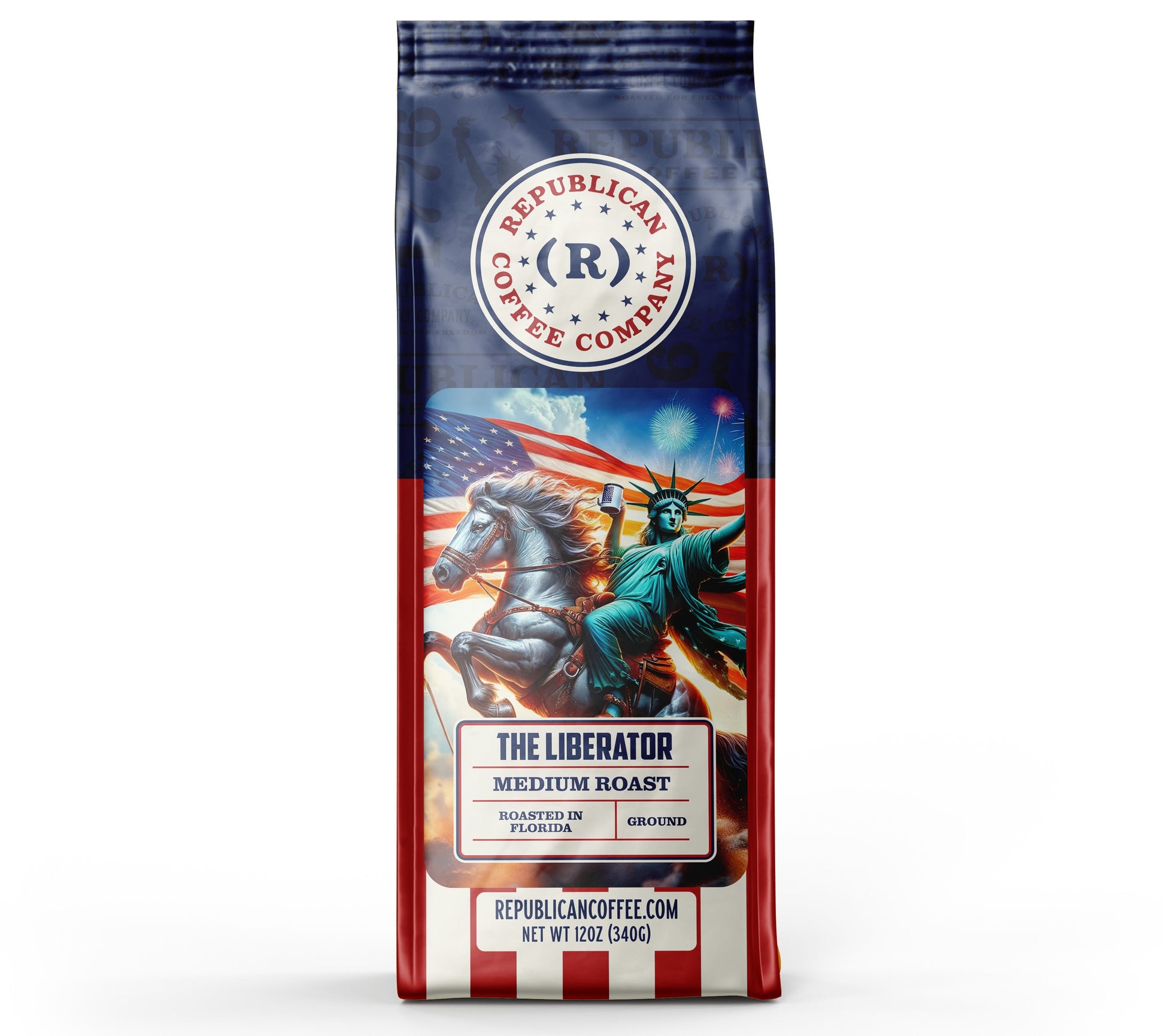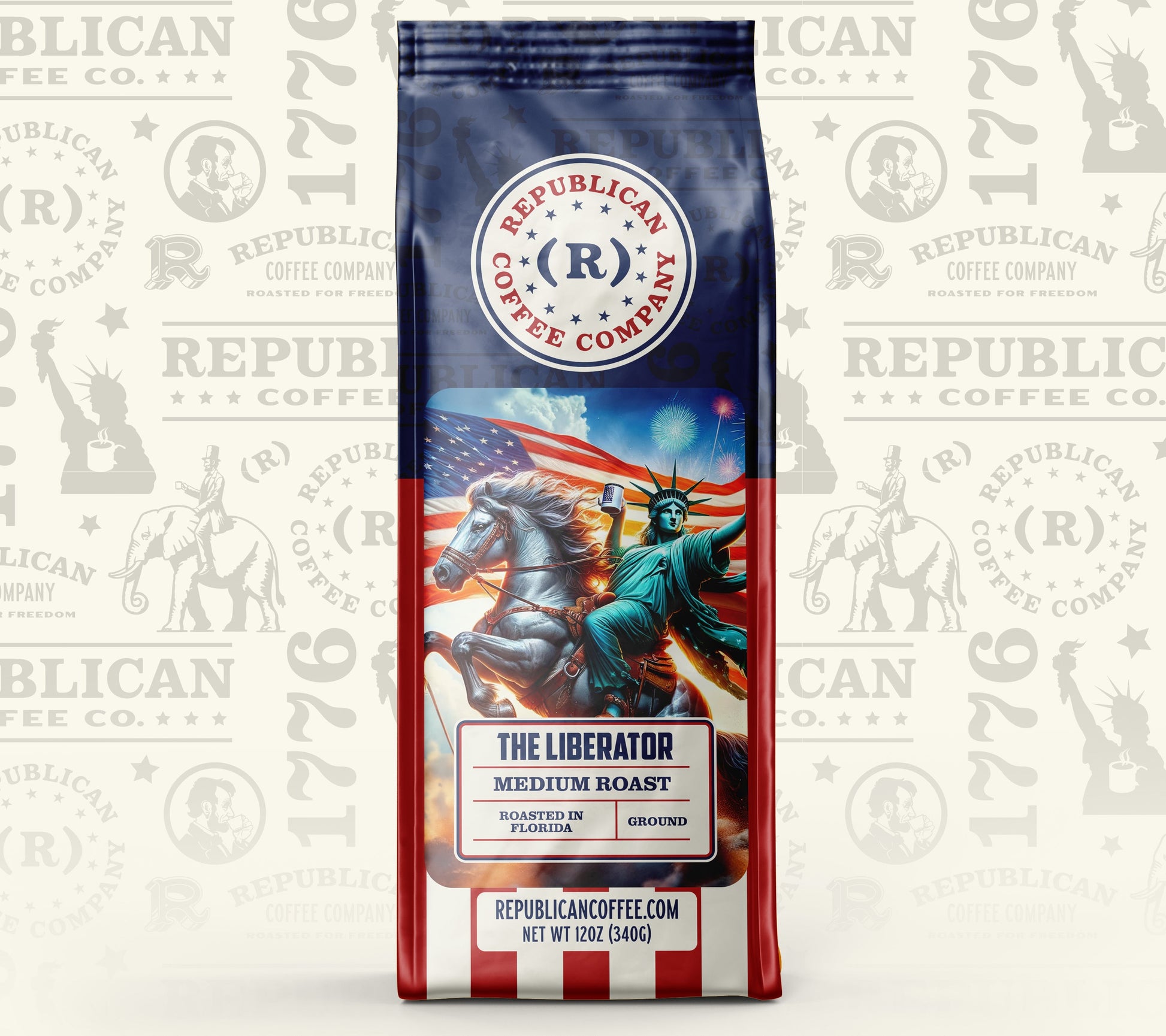 Lady Liberty herself rides high on the bag, coffee cup raised in triumph, reminding you that every sip is a celebration of freedom. The robust, full-bodied flavor offers rich notes of cocoa, subtle spices, and a smooth, earthy finish, with the perfect balance of boldness and elegance.