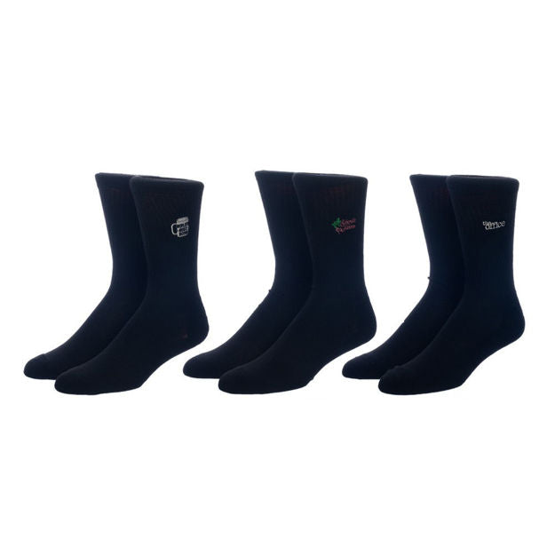Unleash your inner Dundie winner with our Office Embroidered 3 Pack! Featuring three pairs of black socks with colorful embroidery, these socks are sure to make you the star of the office. One pair boasts the iconic "The Office" logo, another showcases a jolly Santa Claus with "Secret Santa" wishes, and the third pair honors the "World's Best Boss" with a coffee cup design. These crew-length men's socks are not just comfortable, they're a hilarious way to show off your love for the hit TV show. Grab a pack today and bring the hilarity of Dunder Mifflin to your feet!