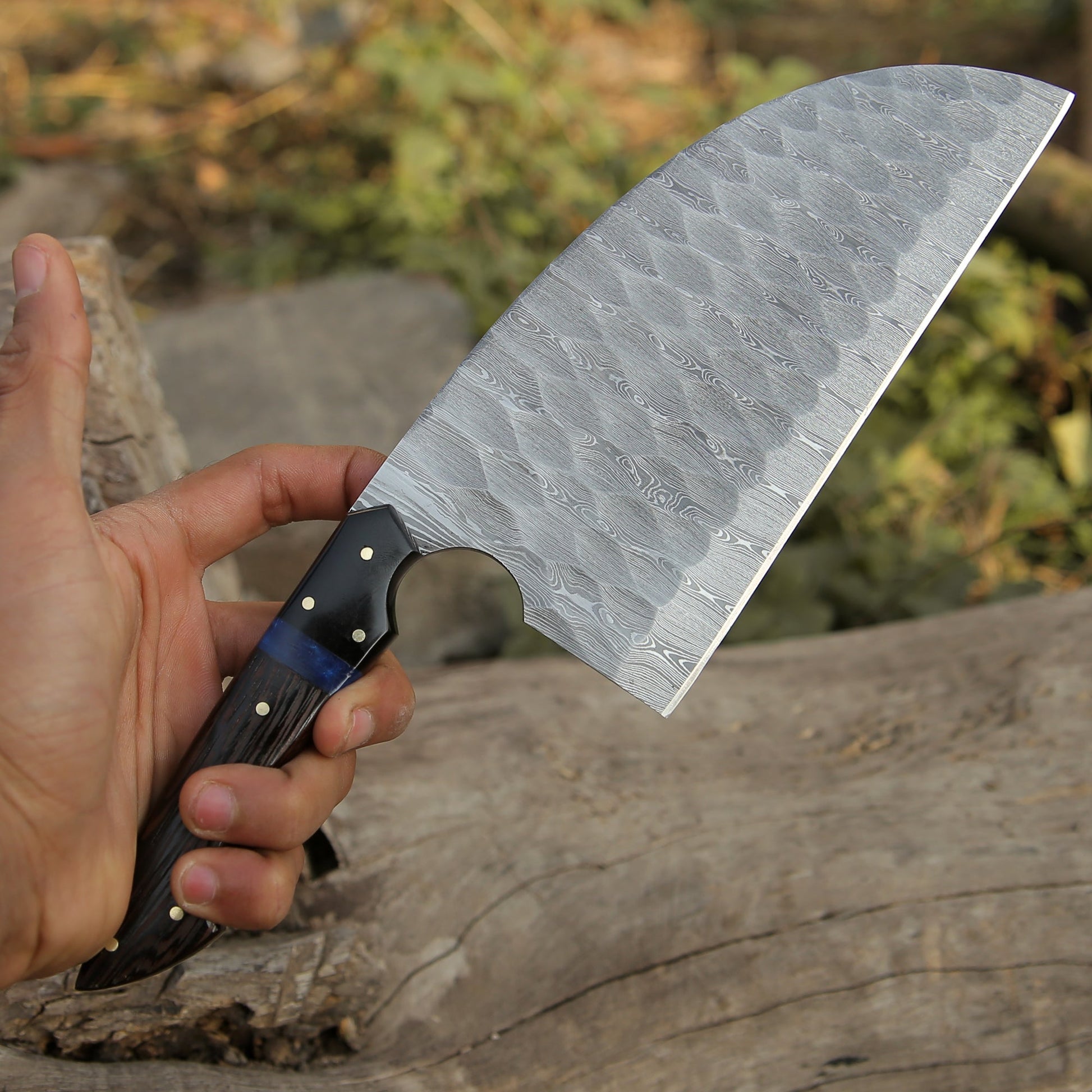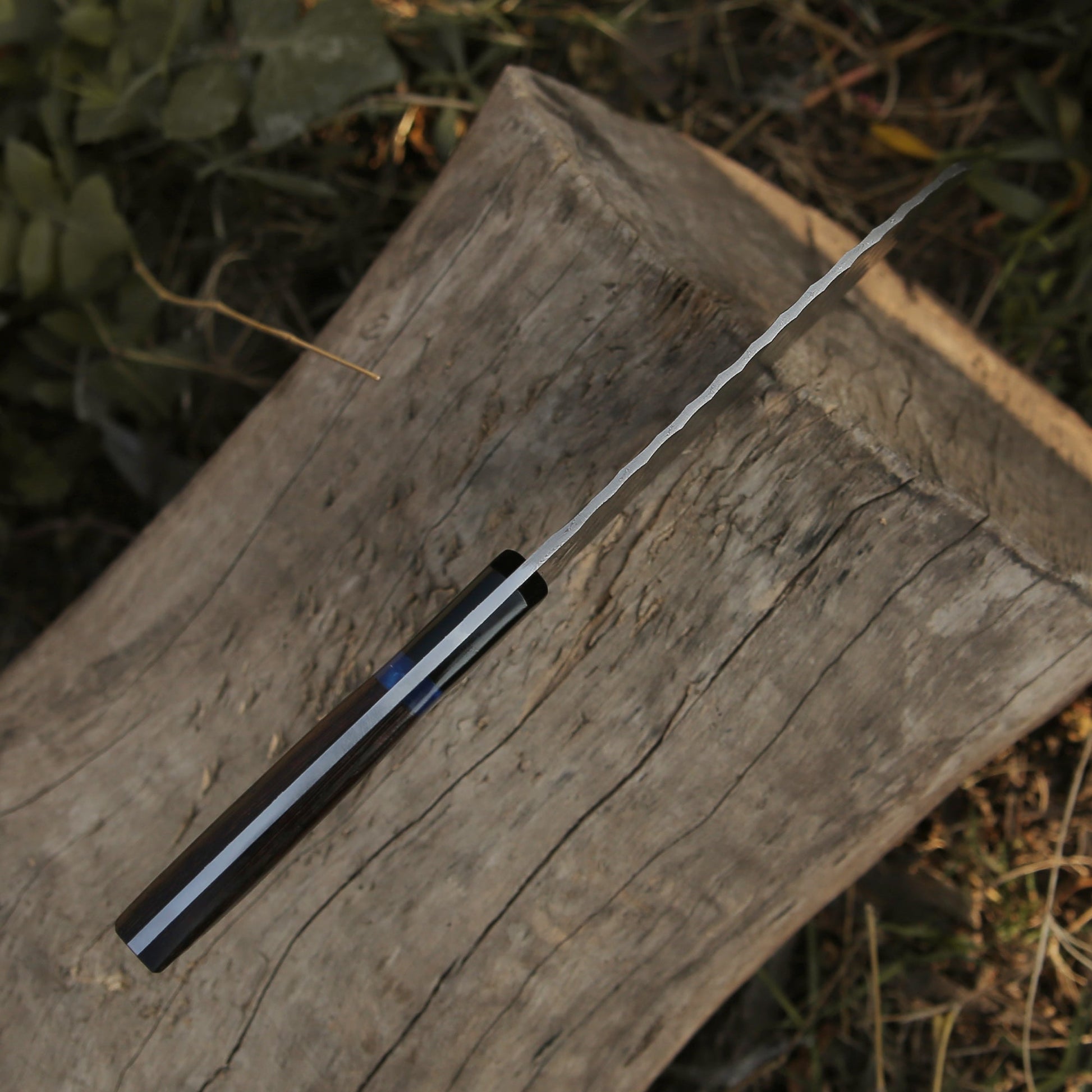 Boasting an impressive design that's impossible to ignore, a blue swirl resin stripe shines nicely to separate the G10 bolster from the grainy Wenge wood handle. Complete with a custom-fitted leather knife sheath, keep your knife safe, secure and looking sharp in every sense of the word. Your knife will arrive with a layer of Food Safe Renaissance Wax and Mineral oil.