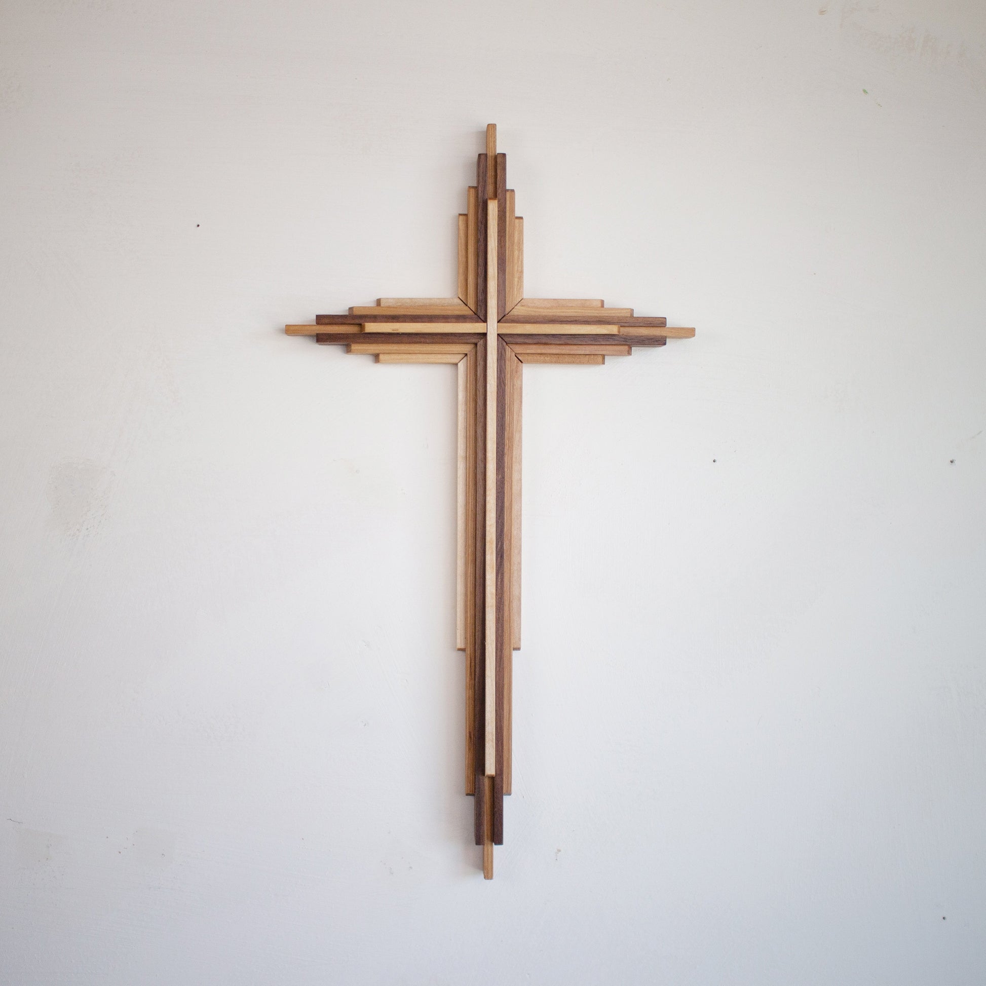 These wall-hanging crosses are handcrafted with three kinds of wood: Oak, Walnut, and Maple. The colors of these woods contrast to create an attractive, multi-color cross that can serve as a beautiful centerpiece in your home, church, or worship space.