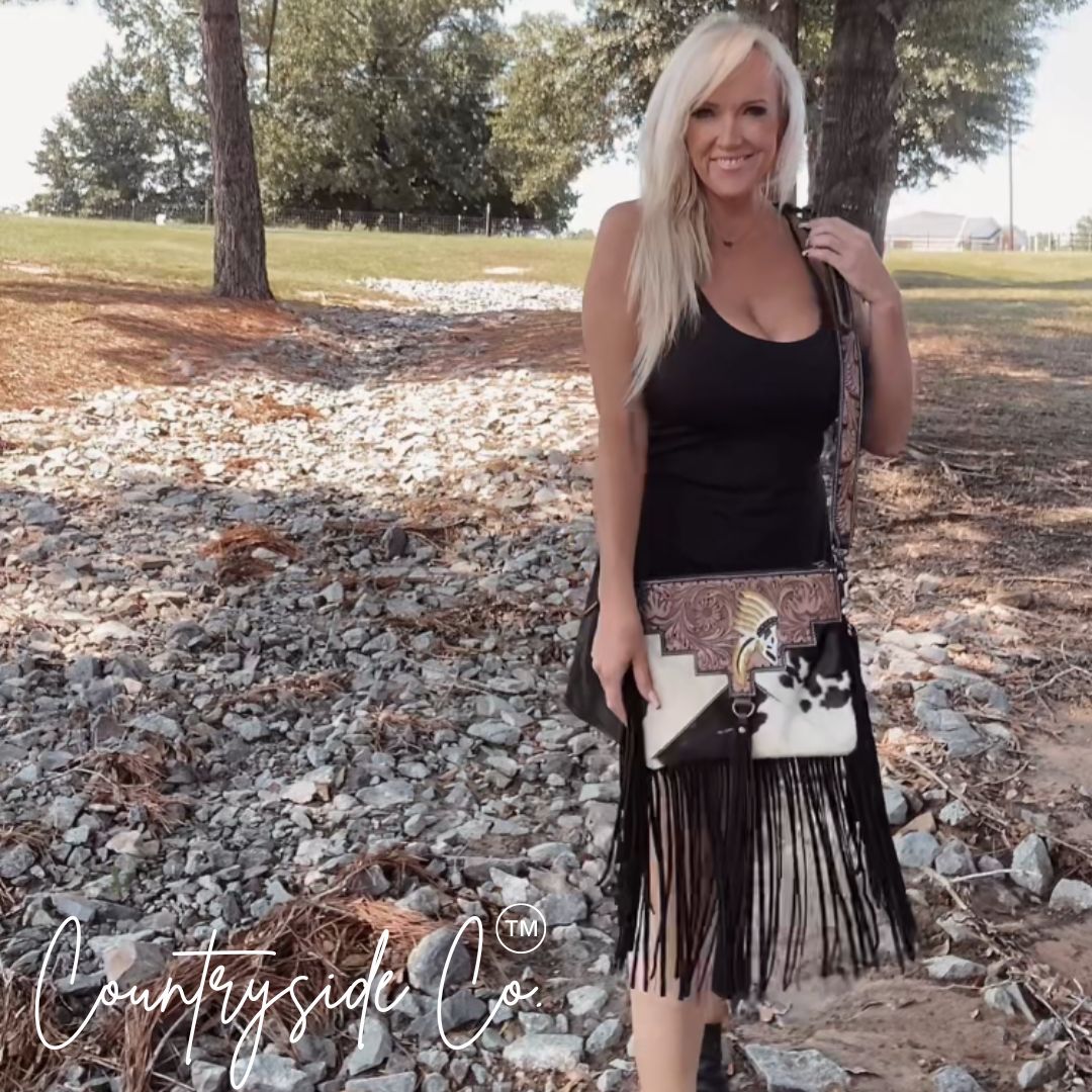 The Outlaw by Countryside Co. is designed with a daring style that you can carry day or night! This is a limited edition! It has a cowhide and tooled leather front with a leather back, finished off with fringes. Each bag is hand painted so allow for imperfections. It has one inside zipper pocket, two inside side pockets and a tooled leather adjustable removable strap. The Outlaw has a height is 9 inches and width 11 inches and strap 49 inches. No two bags are alike because they are made with unique cowhides.