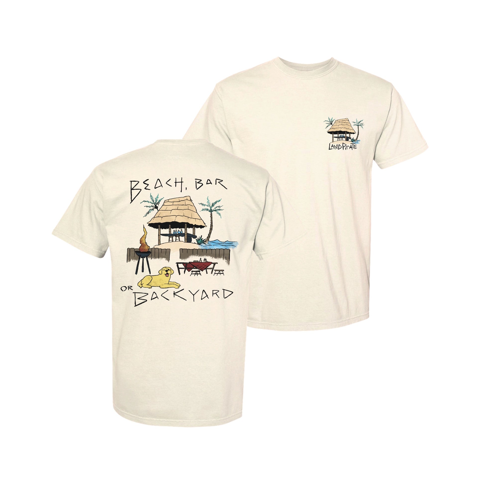 the 'Pac' shows tropical paradise with a tiki bar cookout in the backyard. Featuring the words "Beach Bar and Backyard" amidst the palm trees and beachy vibes, this design captures the essence of laid-back summer gatherings. Complete with a playful puppy enjoying the festivities, it's the perfect way to bring a touch of island charm to your wardrobe.
