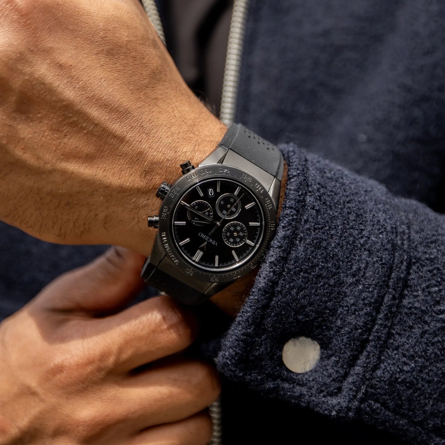 Our men's Rogue - Midnight chronograph sport watch features a 3 hand Citizen Miyota movement and a black silicone watch band. The 316L stainless steel casing features scratch resistant sapphire crystal glass and 5ATM water resistance.