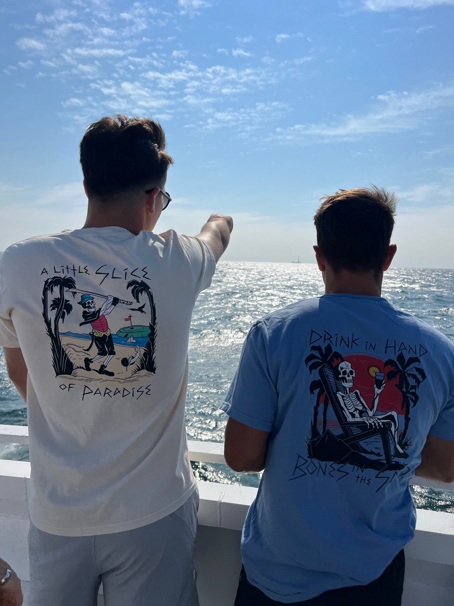 Where the art of golf meets a touch of rebellious flair. The front showcases a meticulously sliced golf ball, a visual ode to the precision and skill integral to the game. Yet, it's on the back where the narrative takes an unexpected turn – a stylishly depicted skeleton, donning a golfer's hat and confidently wielding a sword, infuses an element of daring originality into your attire. This tee is more than just clothing; it's a statement of your distinctive approach, blending the traditional with a bold spirit. Crafted for comfort and style, the "Slice" tee ensures you're at ease whether perfecting your swing or relishing the camaraderie among fellow golf enthusiasts.
