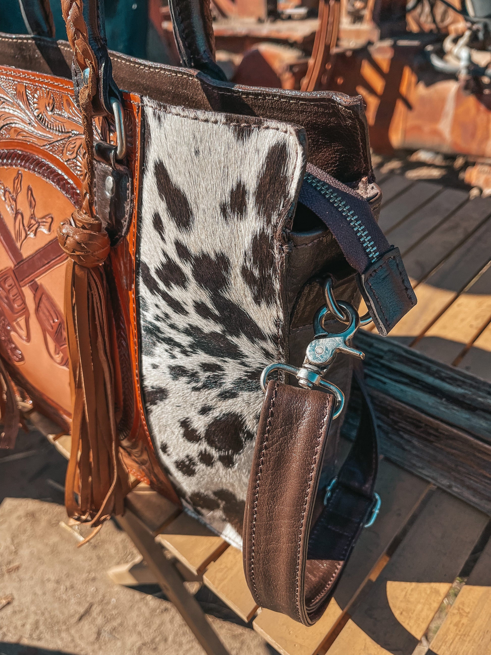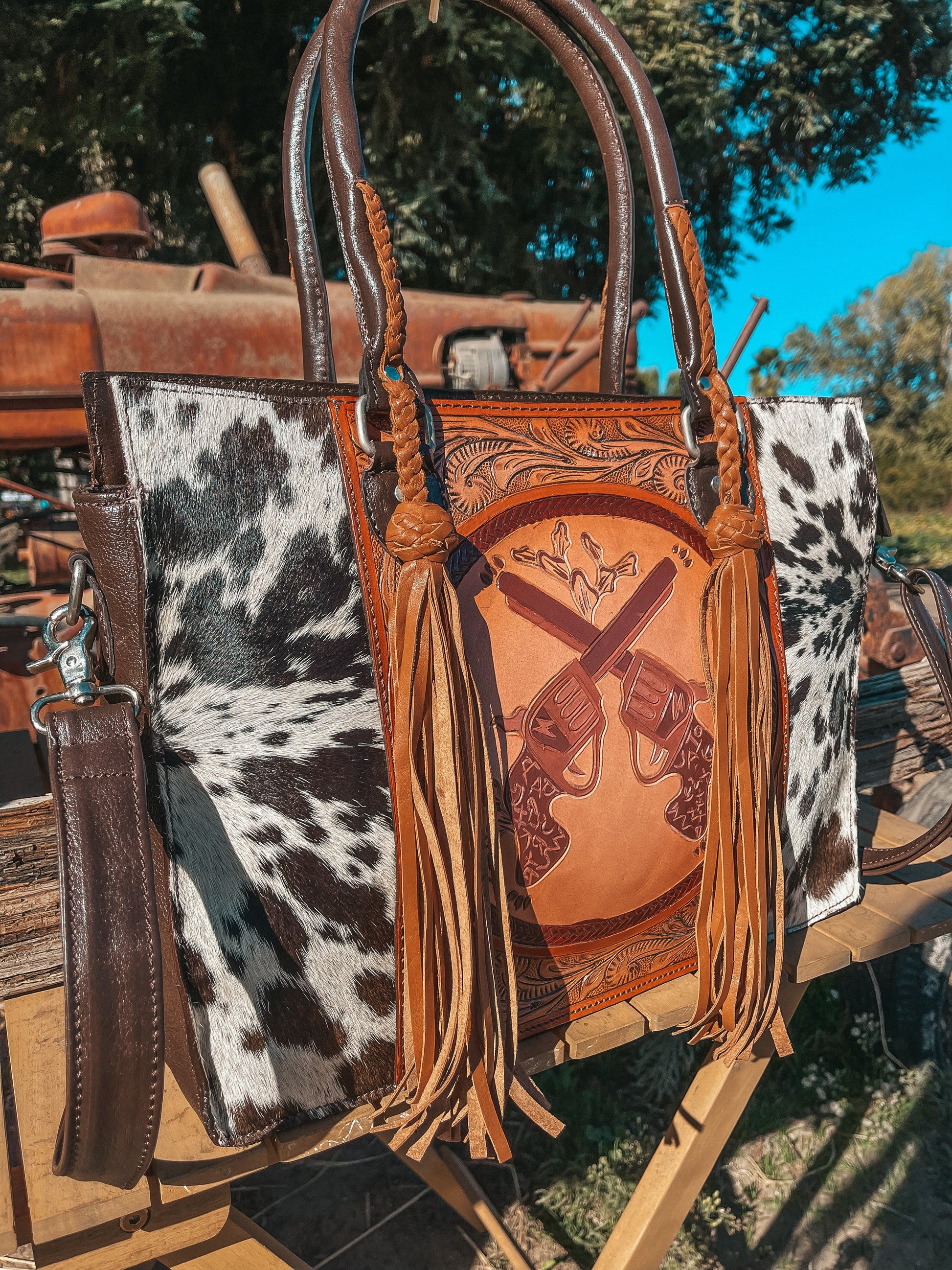 Please note each purse will be one of a kind as each purse is made with a brand new unique cowhide. All bags are hand made and hand painted. Due to this, there may be imperfections in leather tooling and painting.