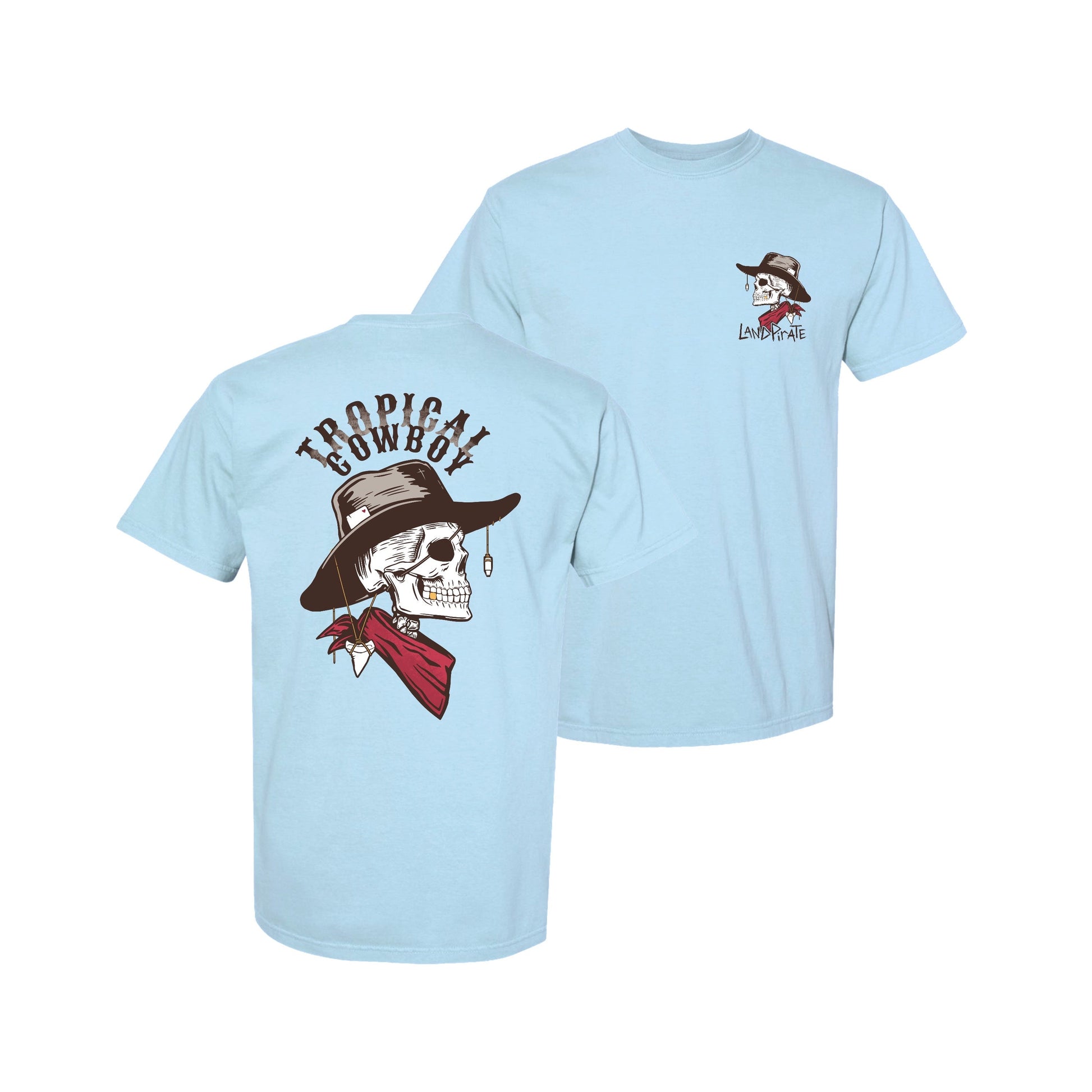 the "Sunset Rider" T-shirt, where rugged cowboy tradition meets coastal allure. Featuring a skeleton cowboy sporting a weathered cowboy hat adorned with a shark tooth, this design captures the essence of adventure and style. Crafted from premium fabric, this tee ensures both comfort and durability for your daily escapades.
