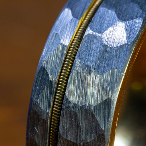 It’s only fitting that this hammered edge ring made from one of the strongest metals (Tungsten Carbide) should be called “The Thor” ring. This ring features beautiful silver Tungsten with a hammered pattern and rose gold color and also gold variant color guitar string inlay to add for an even more unique design.