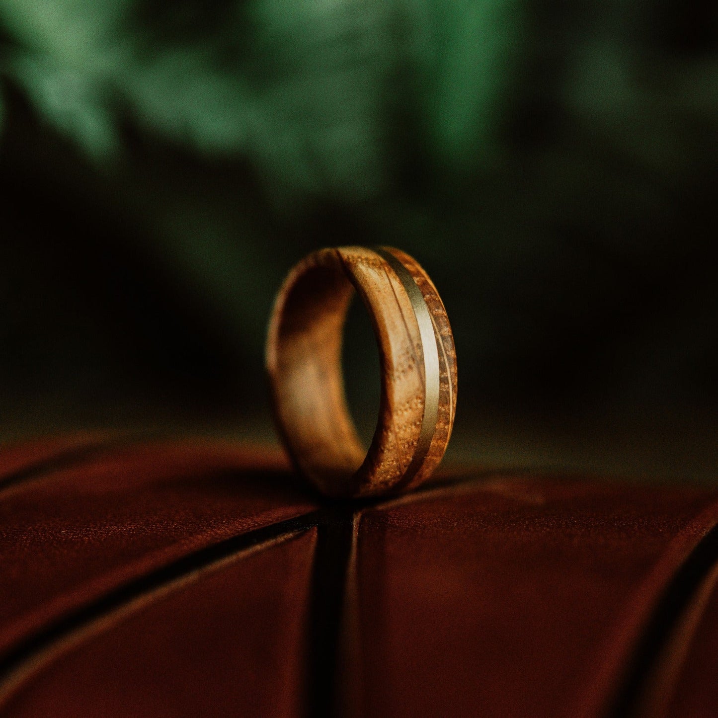 🥃 We designed this ring for the whiskey lover! The wood is full of character from used whiskey barrels that have aged that delicious liquid for years. The wood, in and of itself is beautiful, but to add to the character of the ring even more, a solid brass metal inlay was added for an even more distinguished look.