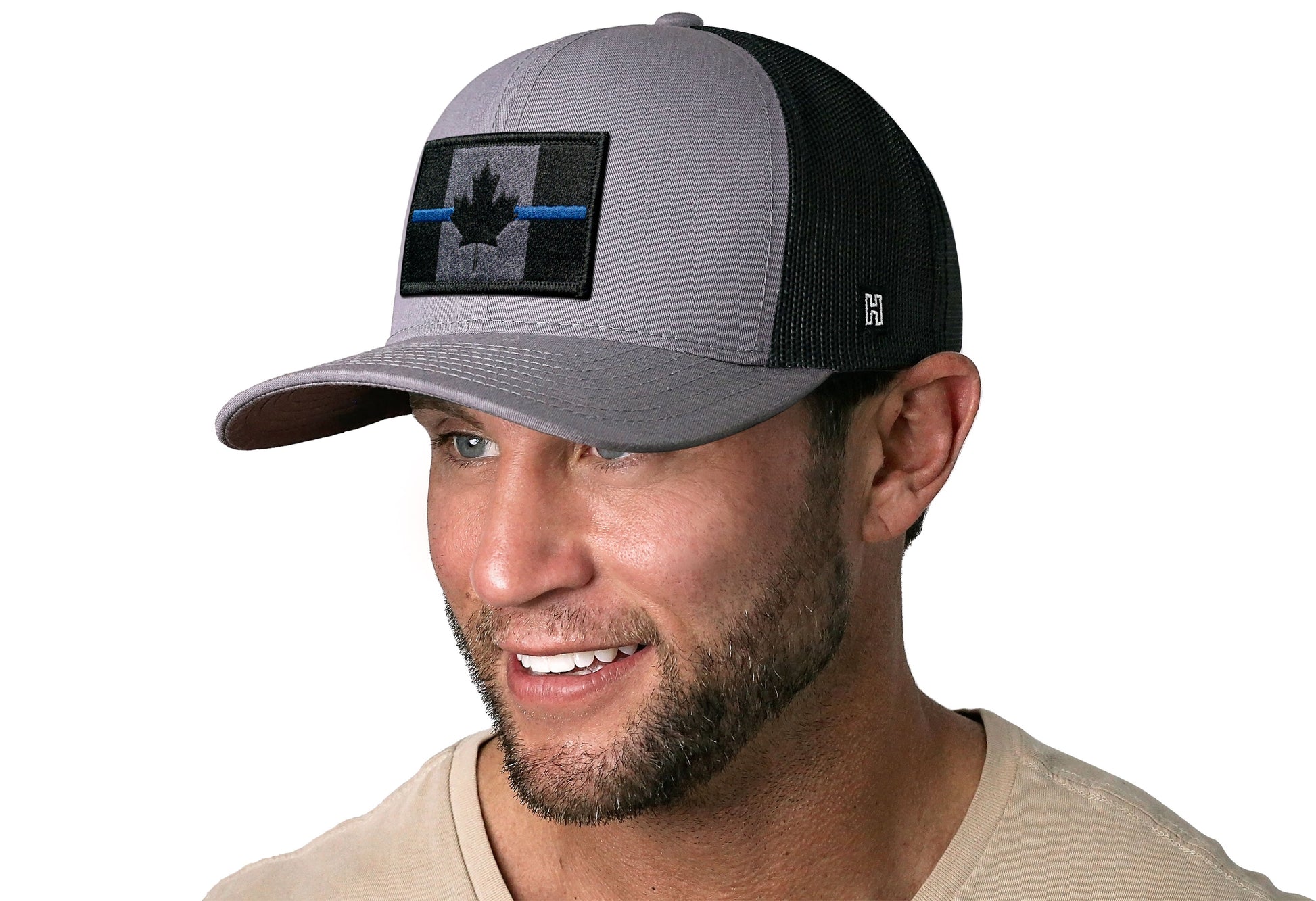 Show your support for Country and law enforcement in style with the HAKA Thin Blue Line Trucker Hat, featuring a premium Canadian maple leaf tactical embroidered flag patch on our gray-black signature 5.0 trucker.