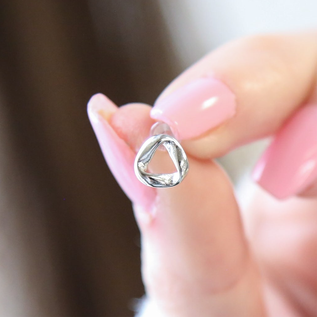 Does not tarnish! These TIERNEY earrings feature rounded triangles crafted from durable silver steel. Their unique design effortlessly adds a touch of sophistication and modernity to any outfit. With their sturdy construction, these earrings are both stylish and long-lasting, making them a must-have for any accessory collection.