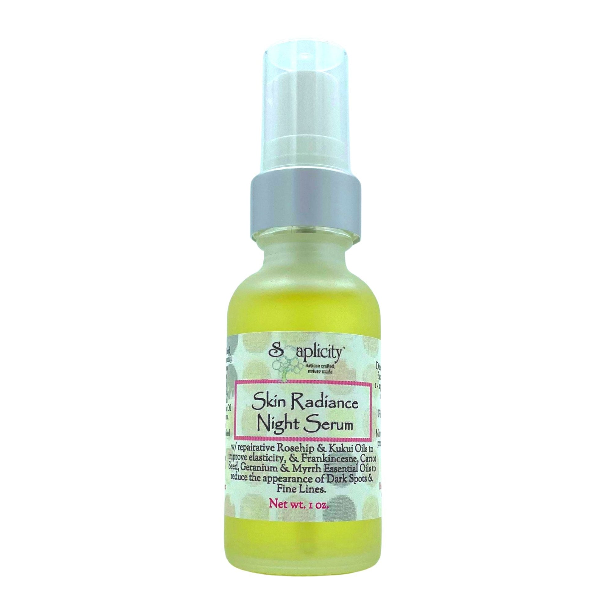 Skin Radiance Night Serum is an all-natural, powerhouse blend of ingredients that work to restore a more youthful appearance as you sleep. The scent is soft and herbal.