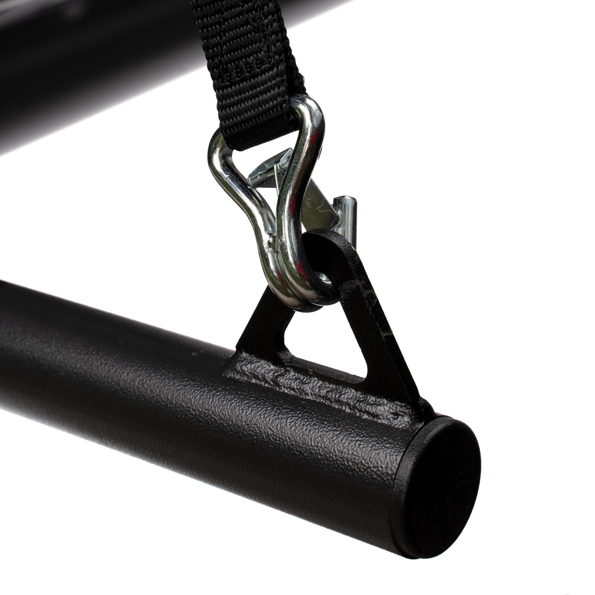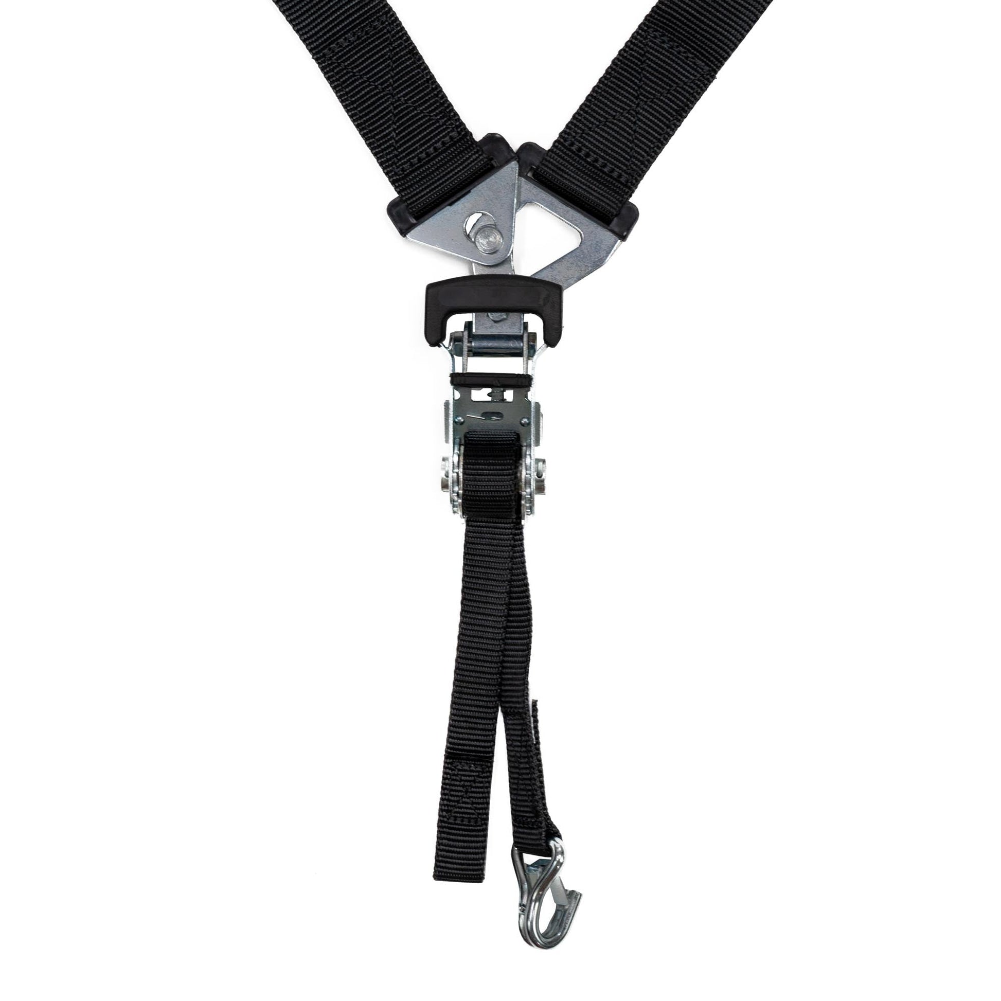 Heavy duty, maximum-stability tire tie down with a ratcheting lever designed for motorcycles with a 645 lb. working load limit.