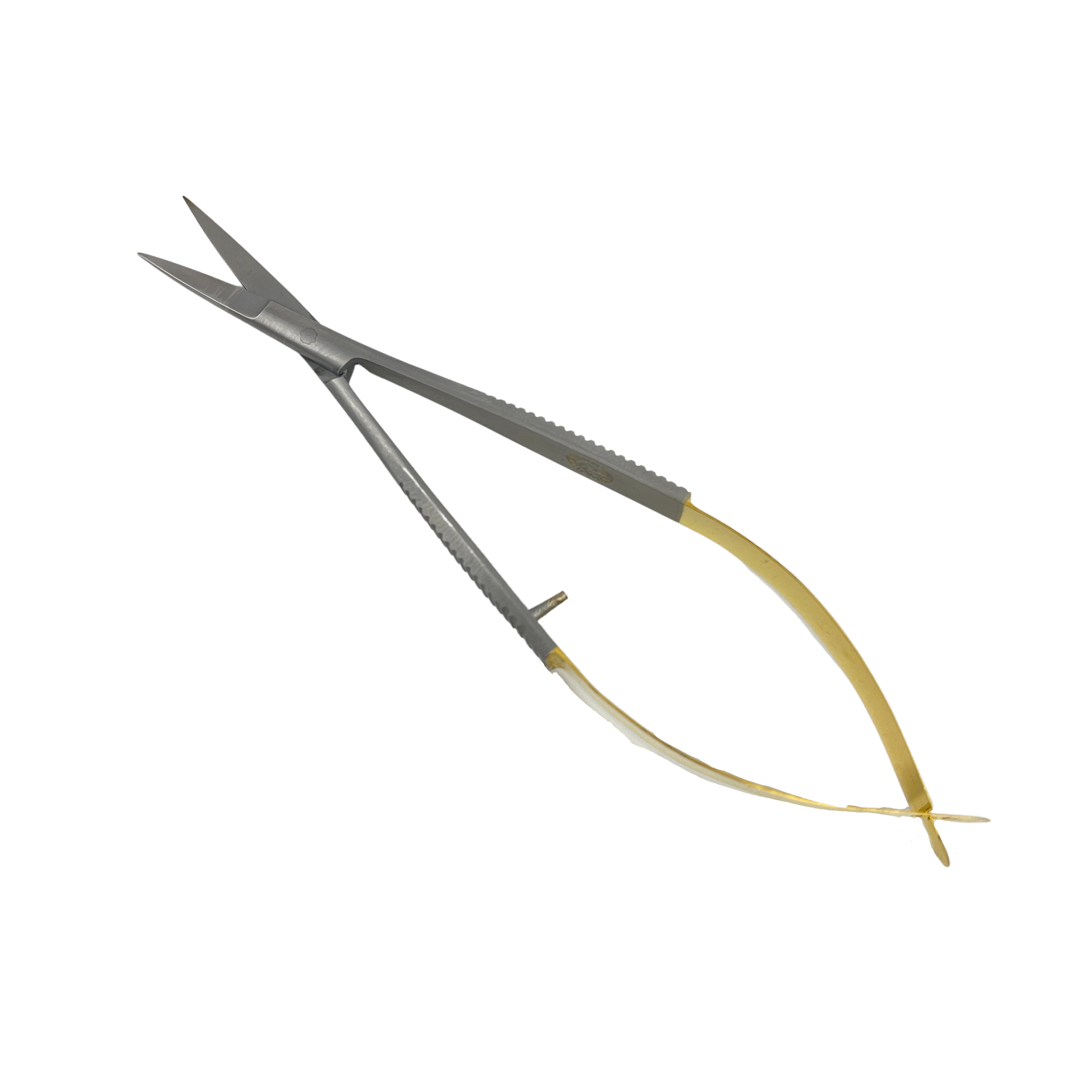 The ultimate one-hand scissor! No loops, just squeeze the spring arms, and the blades cut. Great scissor for detail work and in-hand tying.