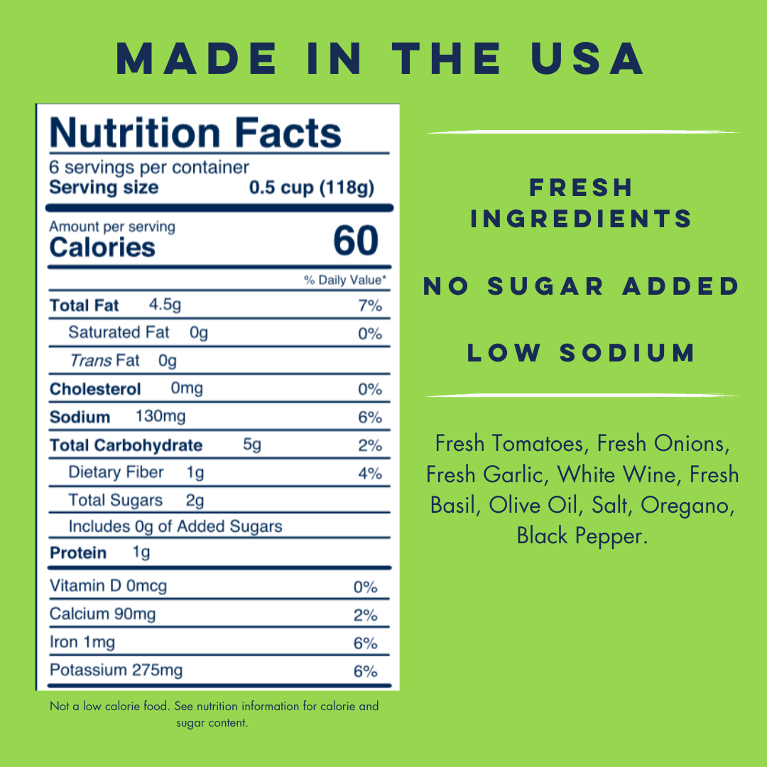 Yo Mamas Tomato Basil is handcrafted with fresh garden tomatoes, basil, onions, garlic and olive oil. Our Mama approved recipe is lovingly made in small batches for delicious flavors and contains no added sugar, GMOs, preservatives or gluten.