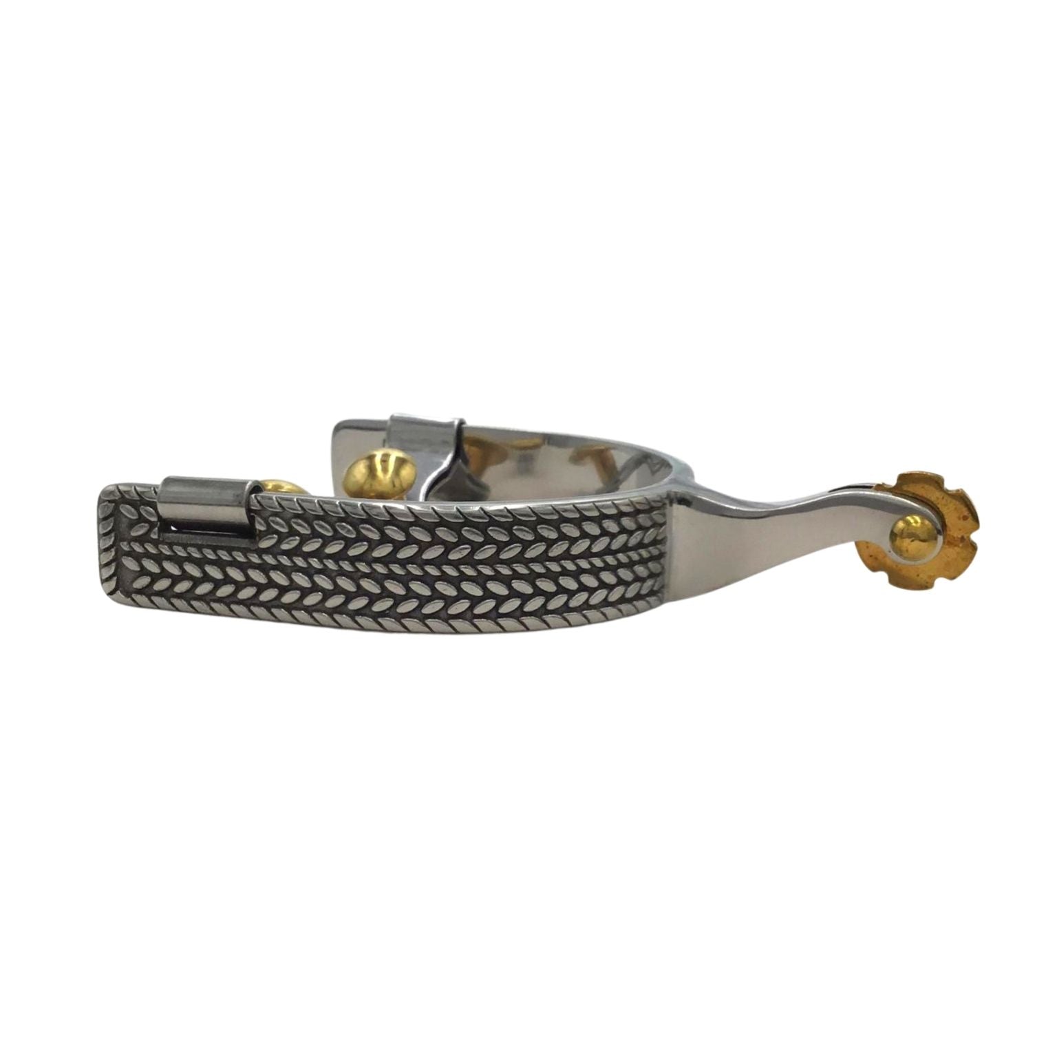 A great looking stainless-steel spur with rope design, 3/4" flat band. 5/8" brass rowels and brass buttons. This is a old time western favorite because it fits right and is designed to work!
