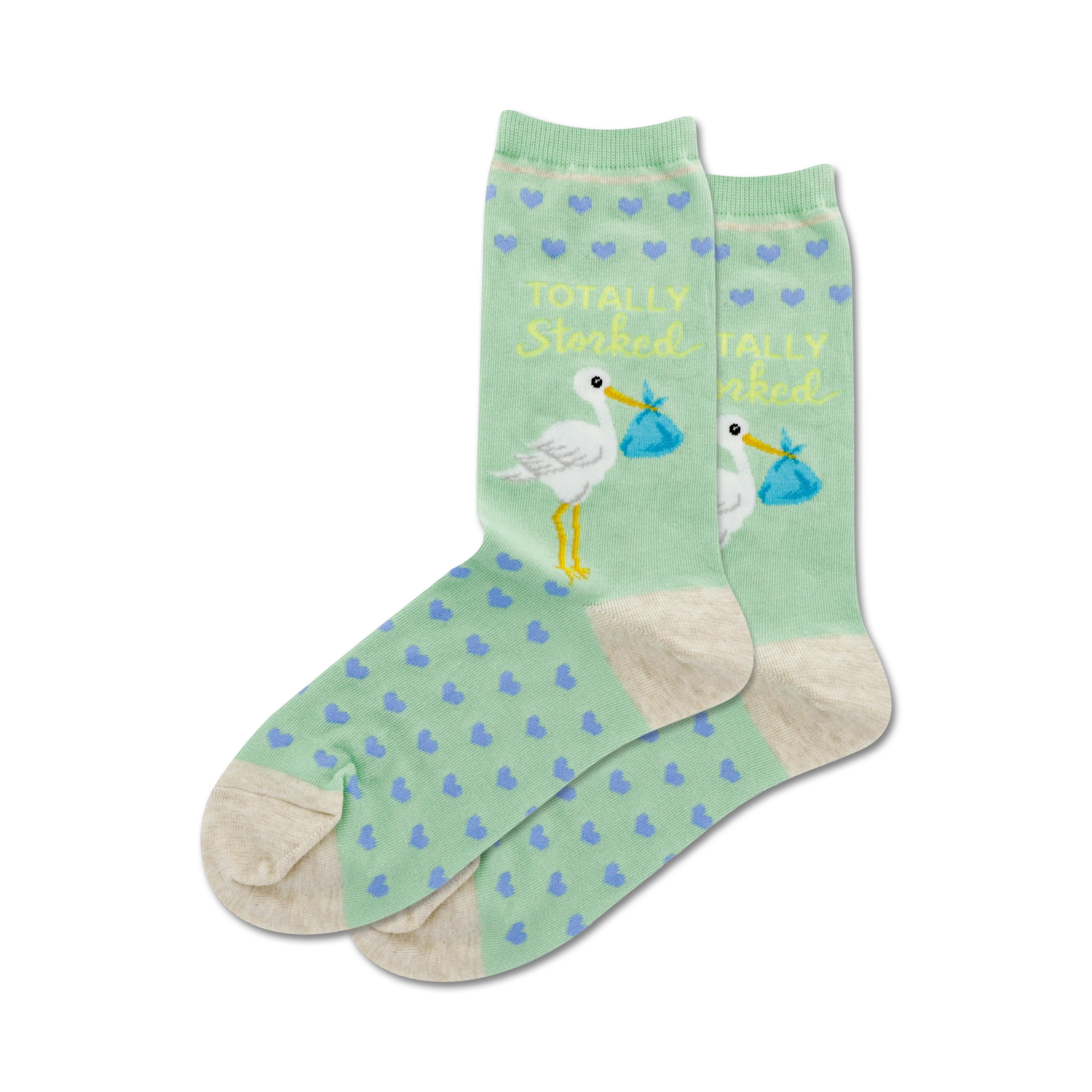 You know what's totally storked? These mint green crew socks with a pattern of blue hearts and the words "Totally Storked" on the top. The yellow stork with yellow legs and blue beak carries a blue bundle in its beak. When you see your reflection in a puddle while wearing these socks you won't be able to help but smile. They're a cute way to announce your pregnancy or show your support for someone who is preggers.