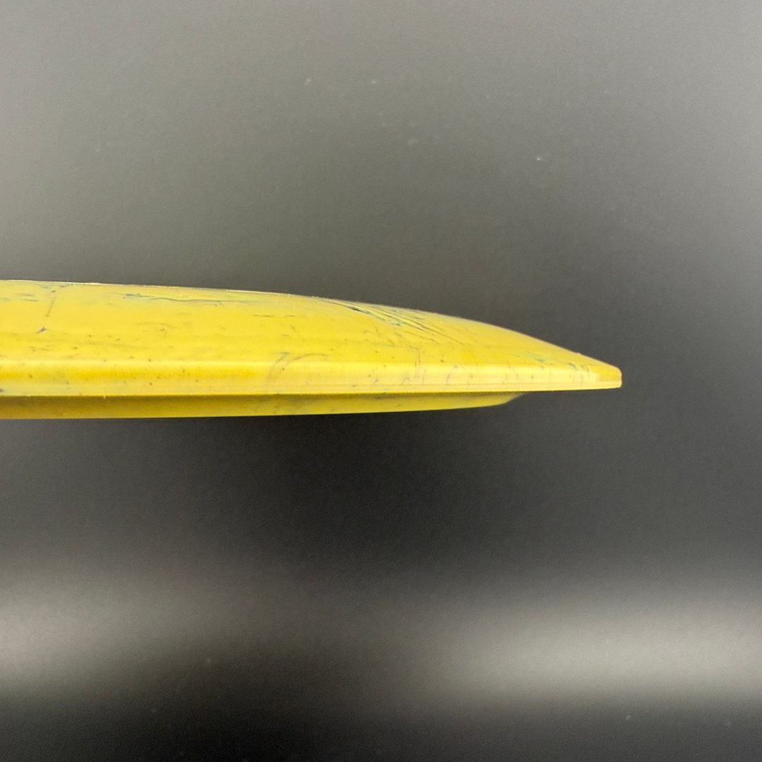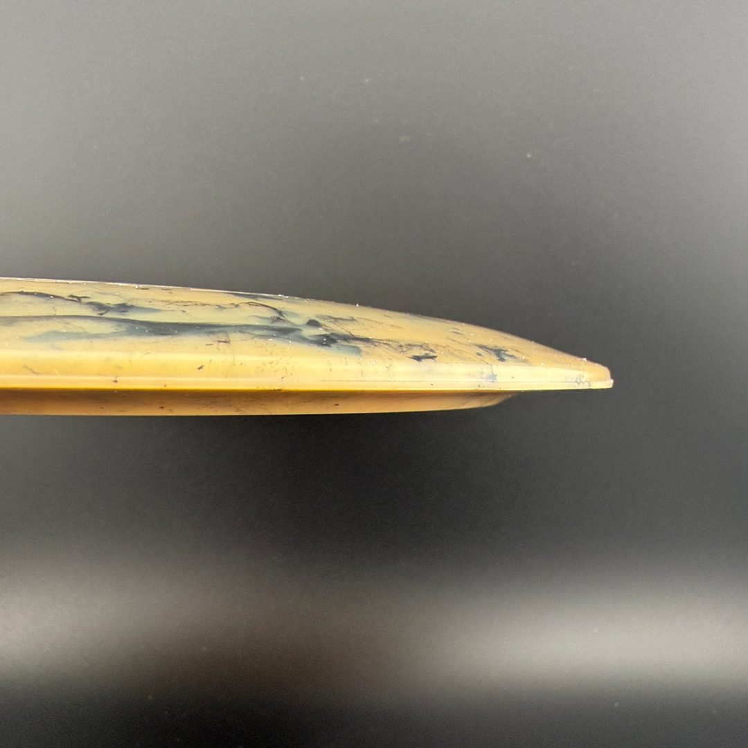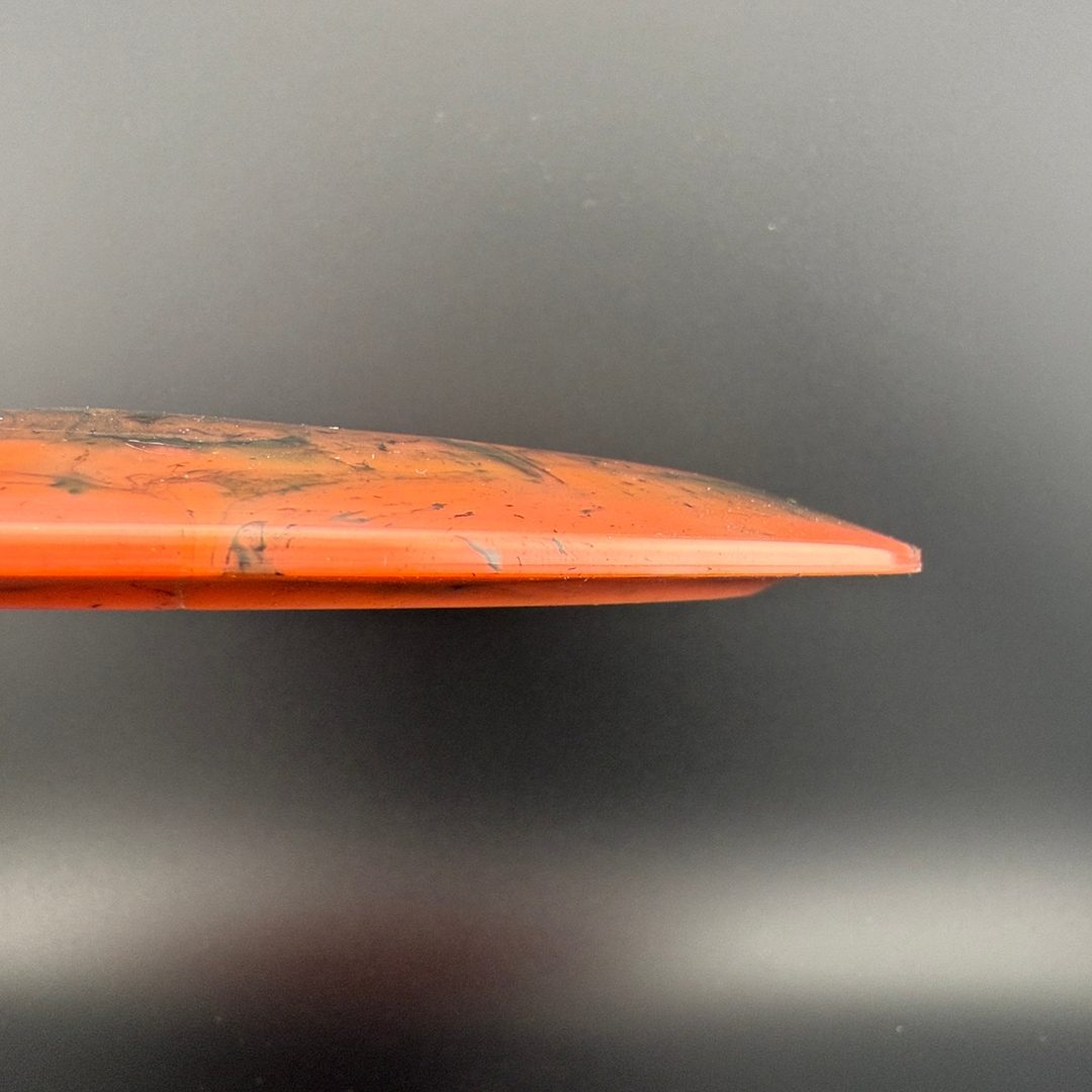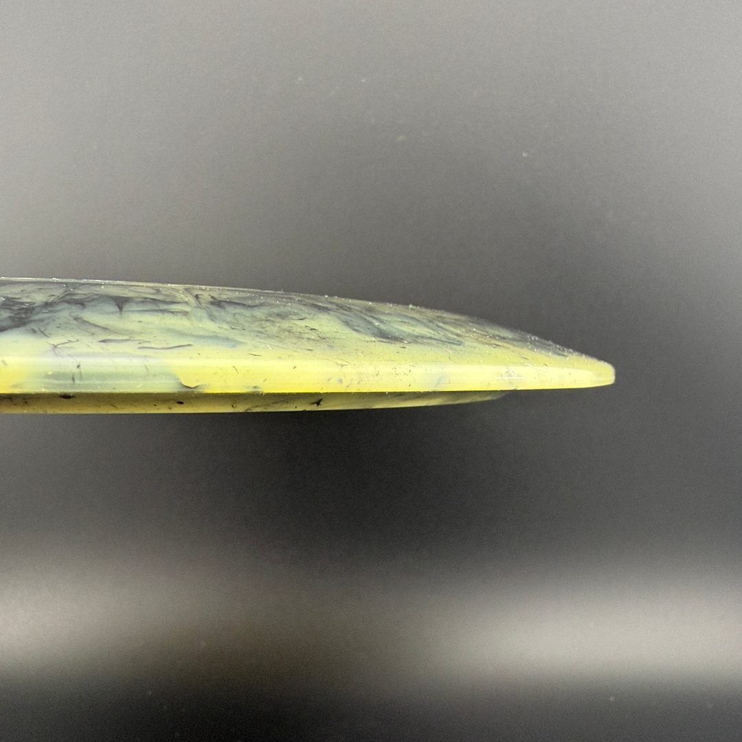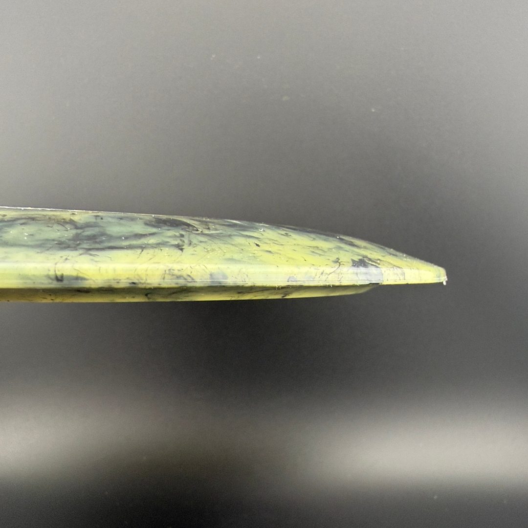 Toxic Waste plastic is a blend used in the Catastrophic Line by Doomsday Discs. It is a durable plastic with nice flexibility and grip. It can vary from being semi-transparent to completely opaque and is characterized by toxic splotches of black and other colors mixed into the blend.