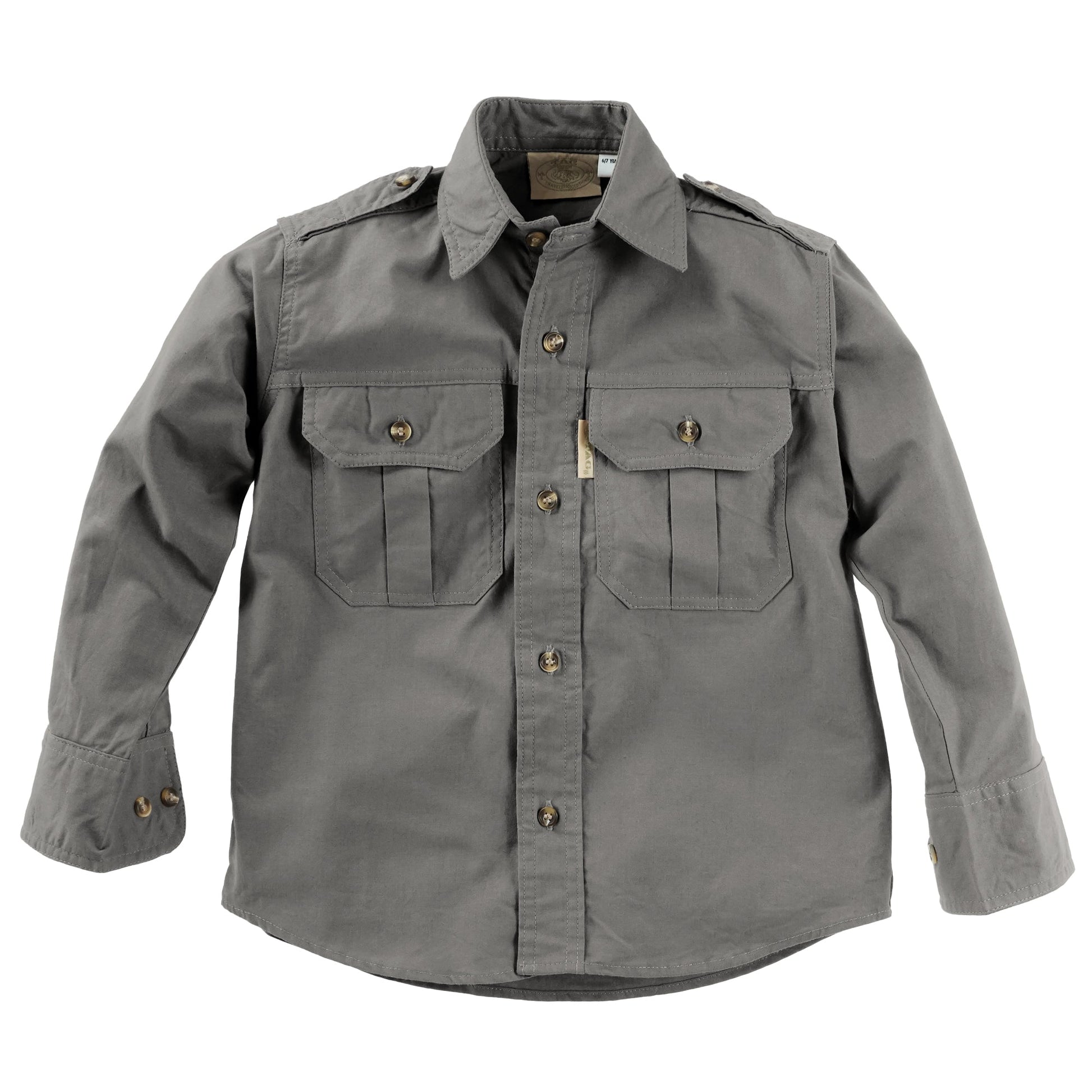 Trail shirt for kids in long sleeves, is a classic outdoor shirt and perfect for activities with the whole family. Two chest pockets with button down flaps carry essential outdoor gear. Functional cross-stitched epaulettes prevent a camera or water bottle from slipping off the shoulder. A double layered back yolk gives extra sun protection, while two back tucks allow extra shoulder swing. Double stitched throughout for durability, with generous sizing and long tails that stay tucked in. Made in Africa from pre-washed and pigment dyed 5 1/2 ounce cotton for a natural worn look. This kid’s long sleeve safari trail shirt will be a welcome travel companion on any adventure.
