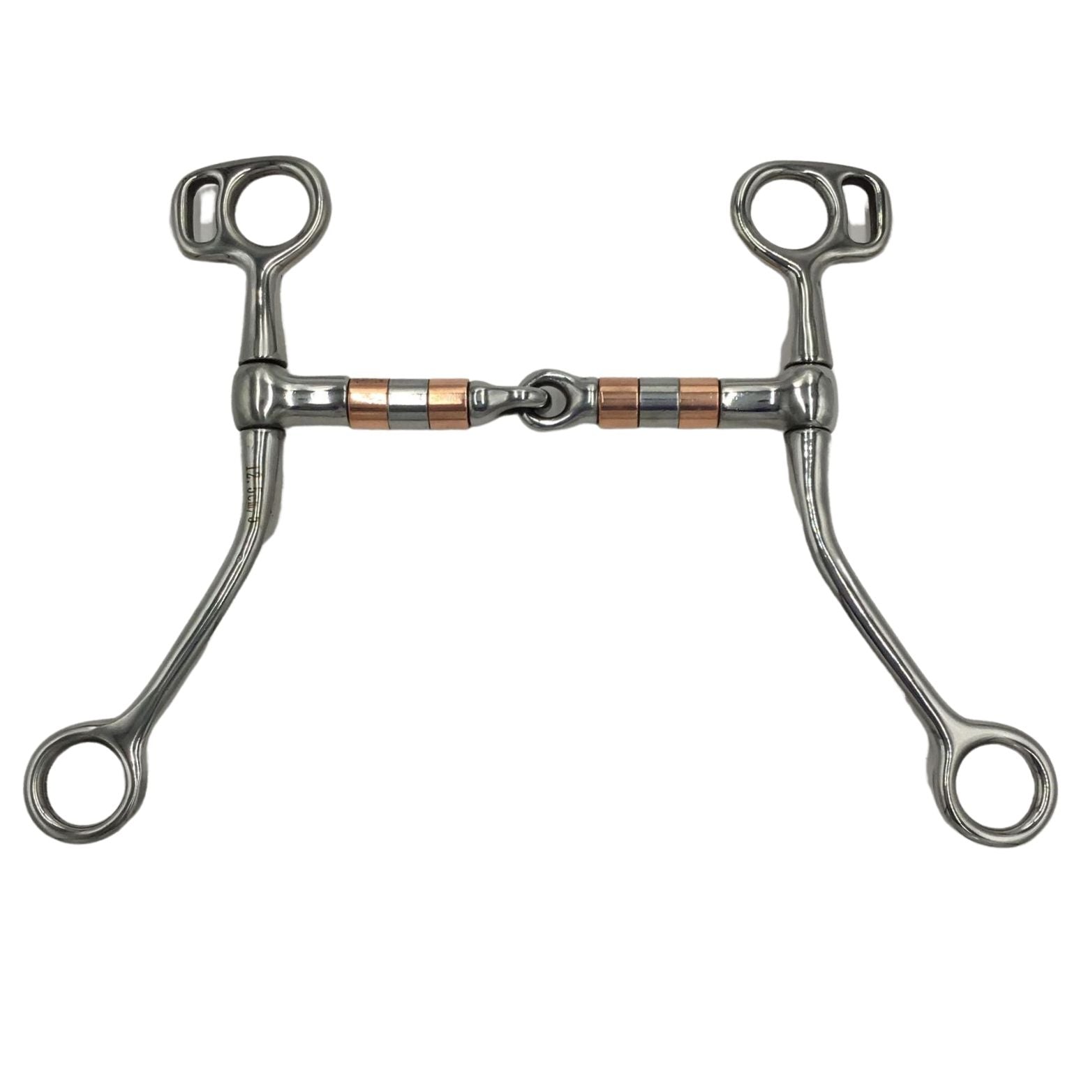 This is a good transition bit for going from a snaffle to a curb. It has a 5" mouth with a 6 1/2" shank. The copper rollers help calm a horse and will help keep the mouth moist. It has low to moderate leverage and can be used as an everyday bit. 7" stainless steel cheeks, 5" mouth with steel and copper rollers