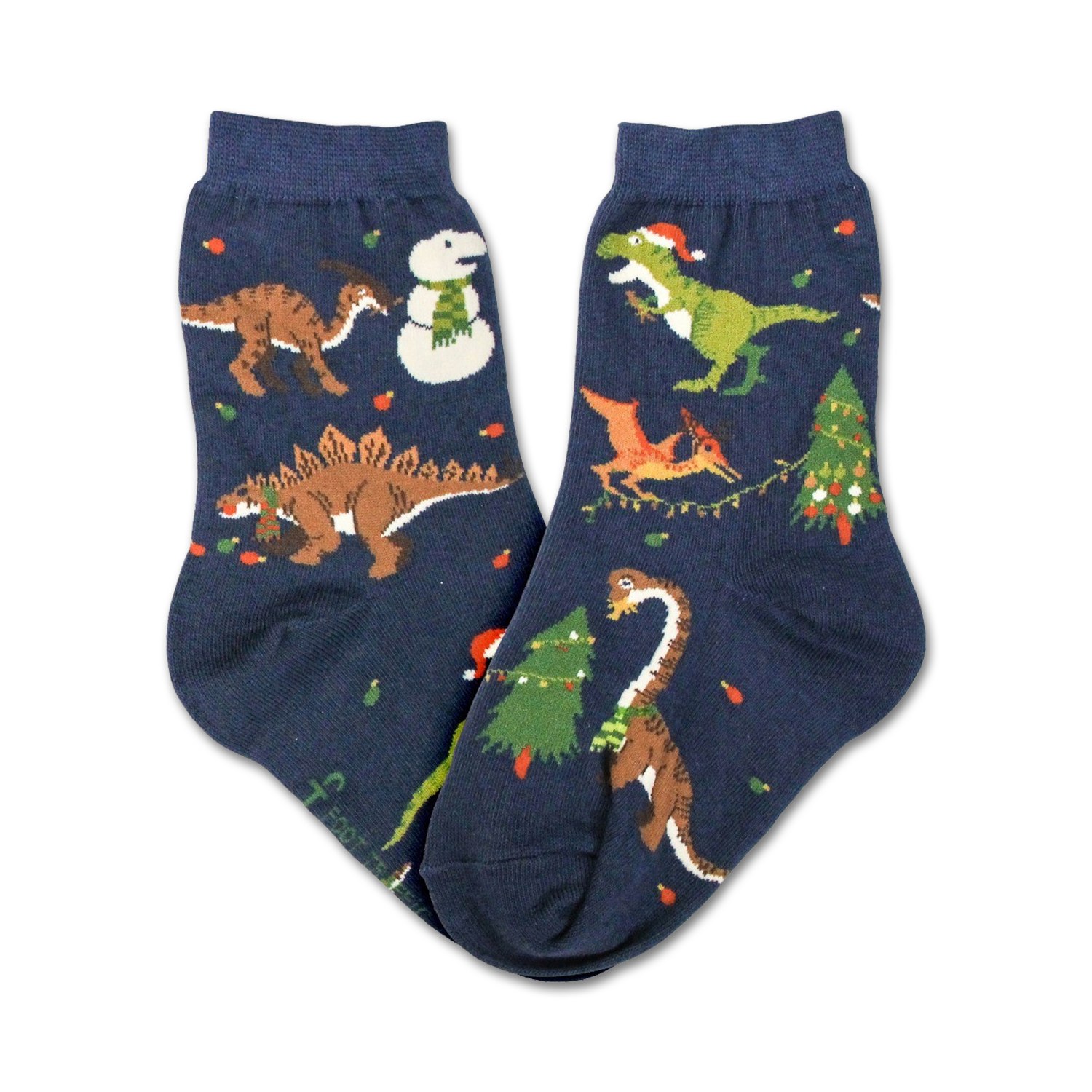 So what could be more Christmassy than dinosaurs wearing Santa hats illuminated by Christmas lights while surrounded by Christmas trees and snowflakes on a pair of dark blue dino-mite crew socks made just for kids? More importantly, who could pass up the chance to learn more about these cool creatures by rocking these socks and proudly declaring, "Hey, look! The dinosaurs are back!"?