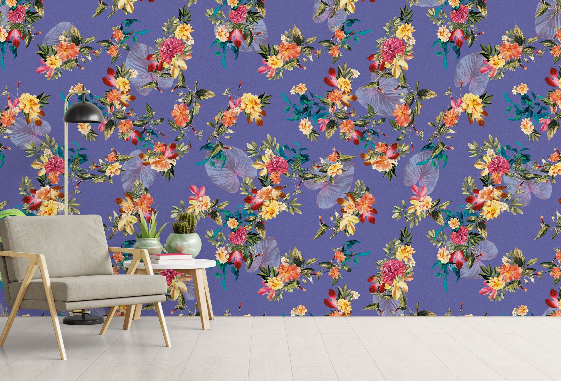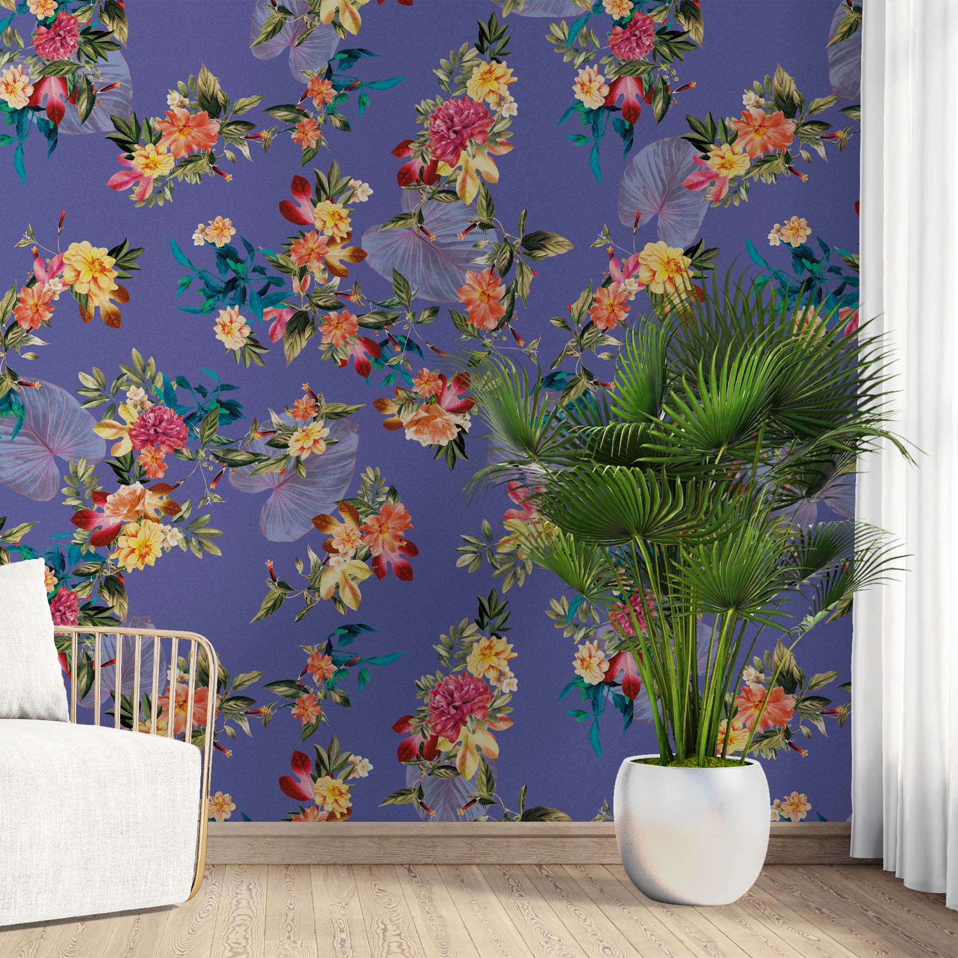 Tropical Flower Wall Mural. Paradise Botanical Flowers and Leave Purple Very Peri Color Background. #6376