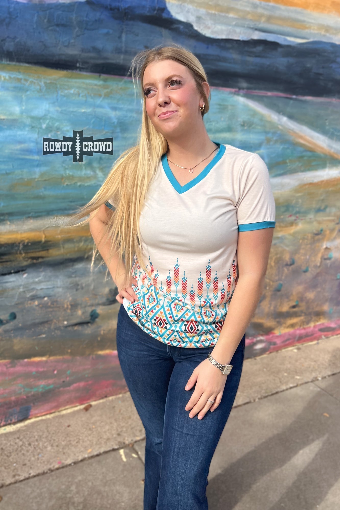 Get ready to fall in love with our Tupelo Tee! Featuring a cute aztec print and a comfortable v-neck, this tee is not only stylish but also true to size. Perfect for any occasion, you'll want to wear it every day. Don't miss out on this must-have wardrobe staple!