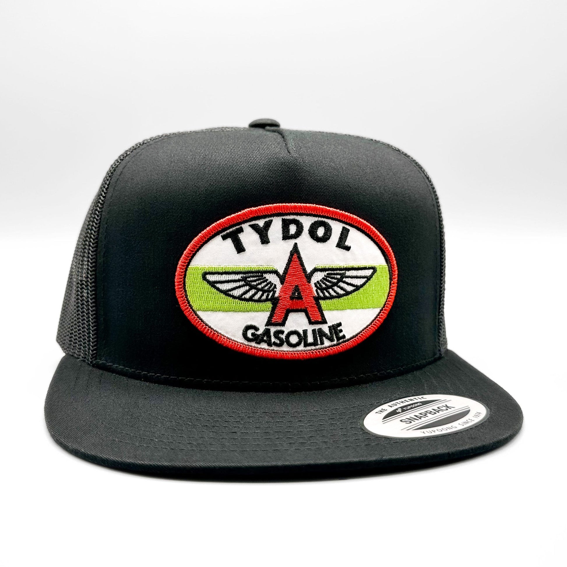 This listing is for a retro 50's style Tydol Gas embroidered patch on one of our best selling (and best fitting) baseball style trucker hats -- a black Yupoong 6006 Classic Snapback Trucker Hat.