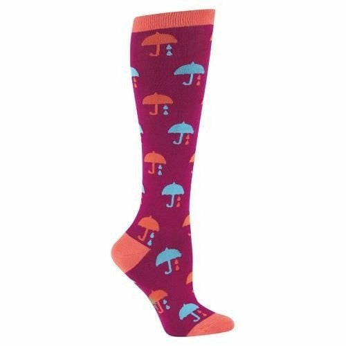 Bring on the rainy weather! These cool socks are guaranteed to be the cutest part of all your puddle-stomping, cozy book-reading, coffee-sipping activities, and still tall enough to peek out above your red rubber boots. Each fun pair of socks have a purple background with adorable blue and orange umbrellas floating around. WARNING: Not waterproof, water resistant, or appropriate for swimming.