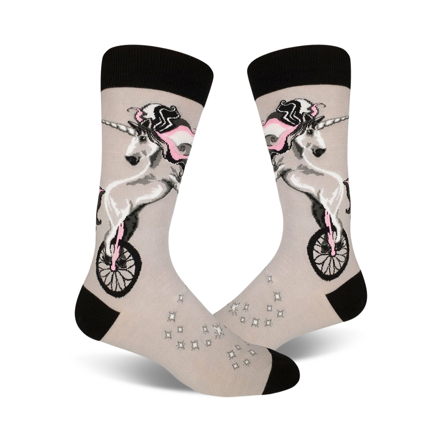 Ride like the wind with your Unicycling Unicorn socks! Our crew-length socks feature a magical pattern of a unicorn riding a unicycle under a star-studded sky. Guaranteed to add a whimsical touch to any outfit, these gray, black and white socks with their pink highlights will brighten up your day. Get ready to spread smiles wherever you go!